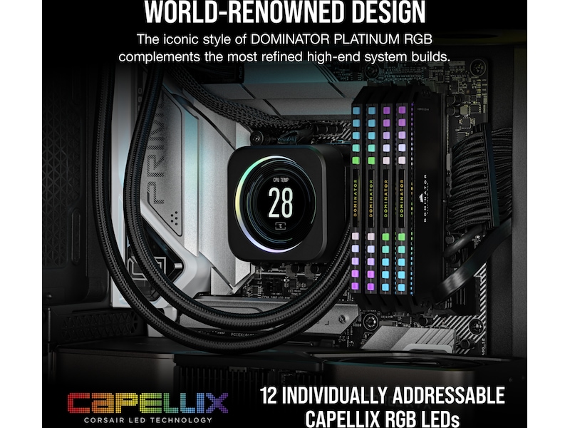 RAM-funksjoner Høyytelses PCB, Innebygd ekstrem overklokking Power Management IC (PMIC), Intel Extreme Memory Profiles (XMP 3.0), Anodized aluminum heatspreader, Dual-path Heat Xchange (DHX), Corsair iCUE-støtte, Spenningsreguleringsstøtte, Dynamisk flersone RGB-belysning, 12 ultralyse individuelt adresserbare CAPELLIX RGB LED-er