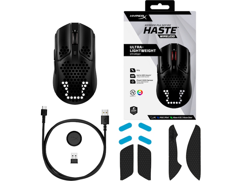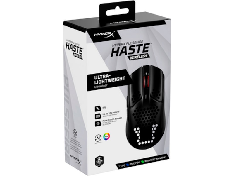 Den trådløse gamingmusen HyperX Pulsefire Haste har alle de beste funksjonene fra den ekstremt lette Pulsefire Haste pluss en trådløs tilkobling og lang batteritid, men med bare 2 g ekstra vekt. Hvis du har vært nølende med å klippe ledningen til musen, så ikke vær redd. Pulsefire Hastes rapporthastighet på 1 ms og 2,4 GHz-signal sørger for en trådløs tilkobling med lav ventetid som oppfyller kravene til elitespillere.