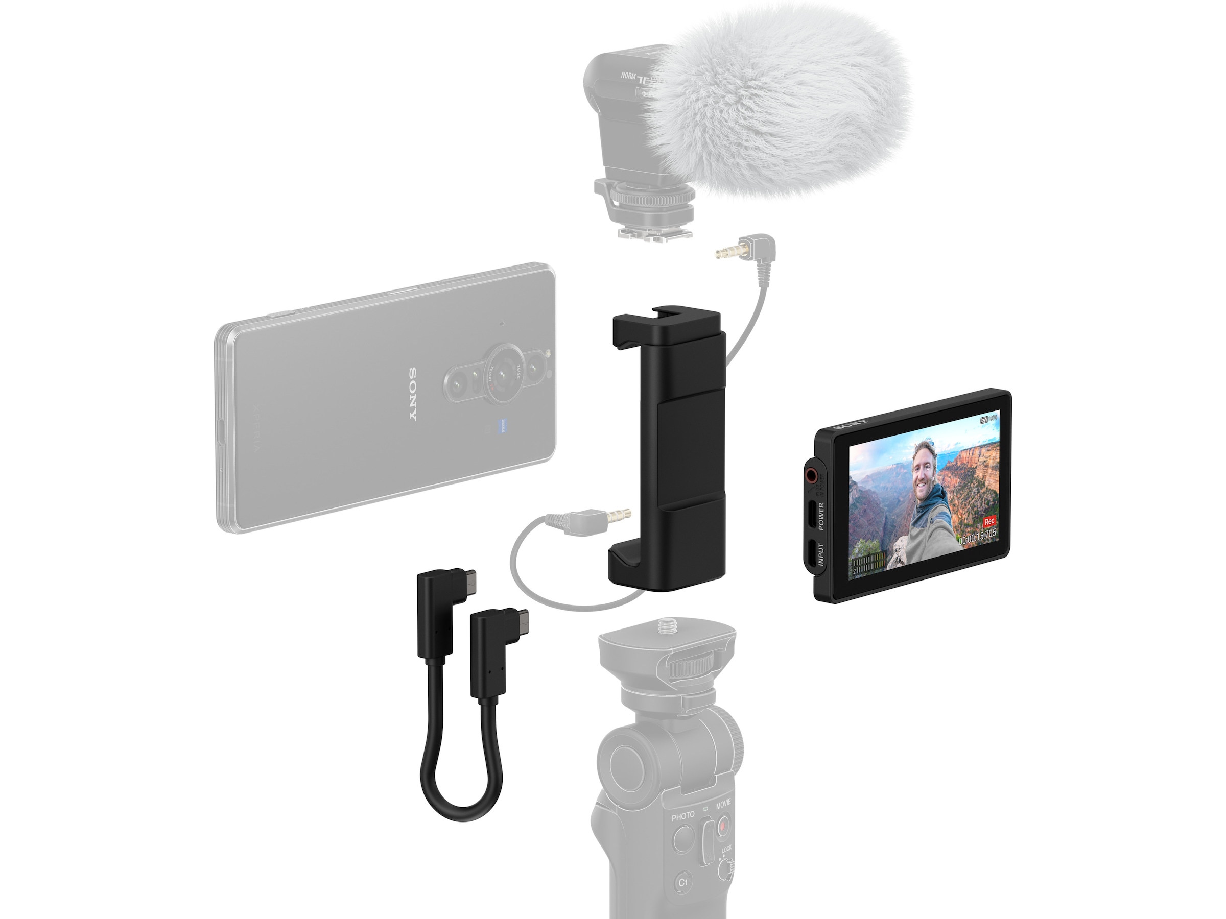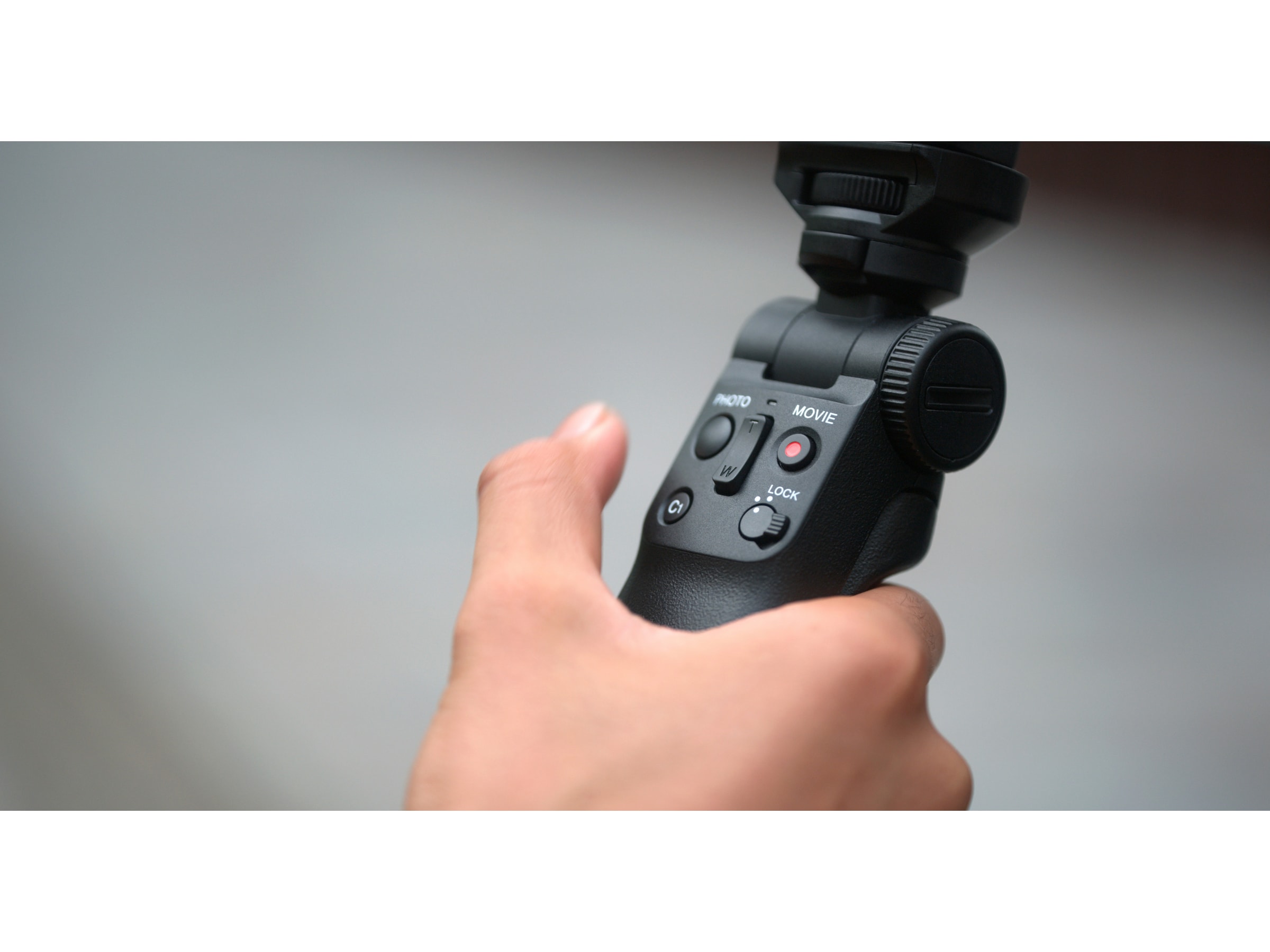 Når du fotograferer med Vlog Monitor og en kompatibel smarttelefon kan du koble til opptaksgrepet med Bluetooth-tilkobling Grip GP-VPT2BT. Det gjør det mulig å starte og stoppe opptaket uten å røre noen av knappene på smarttelefonen.