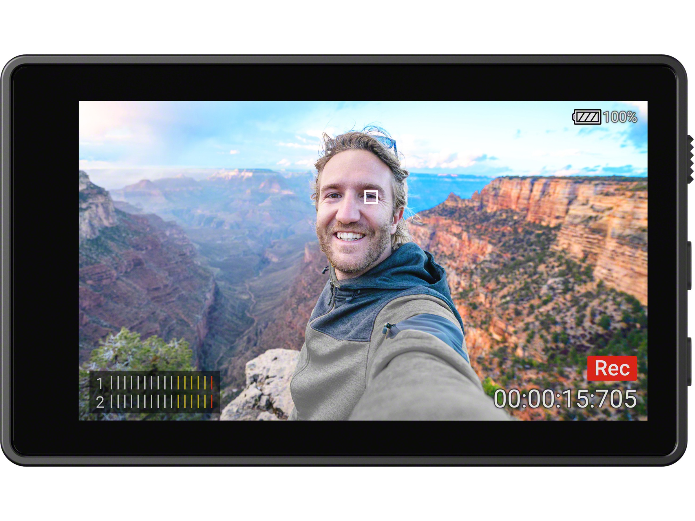 Vlog Monitor har en tredelt 3,5 mm mikrofonkontakt som lar deg koble til med din egen eksterne mikrofon og spille inn enda bedre lyd. Det er bare å montere mikrofonen på festet til tilbehørsskoen øverst på holderen. Den har også 1/4-20 UNC-type festepunkter, én nederst på holderen og én på baksiden av monitoren, slik at du kan feste annet tilbehør, for eksempel et stativ (tripod), et grep eller en selfiestang.