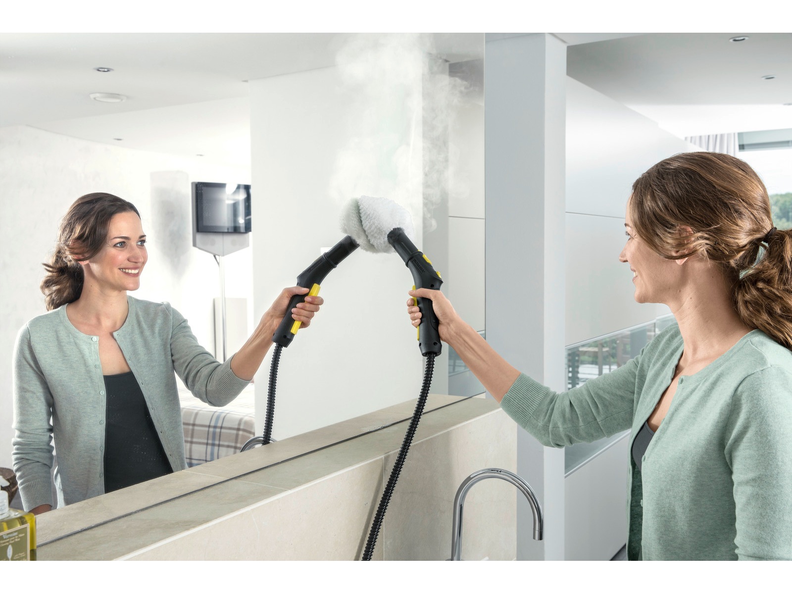 Dampvaskeren SC 3 EasyFix med gulvrengjøringssettet EasyFix og avkalkingspatron gir uavbrutt rengjøring takket være vanntanken som kontinuerlig kan etterfylles.