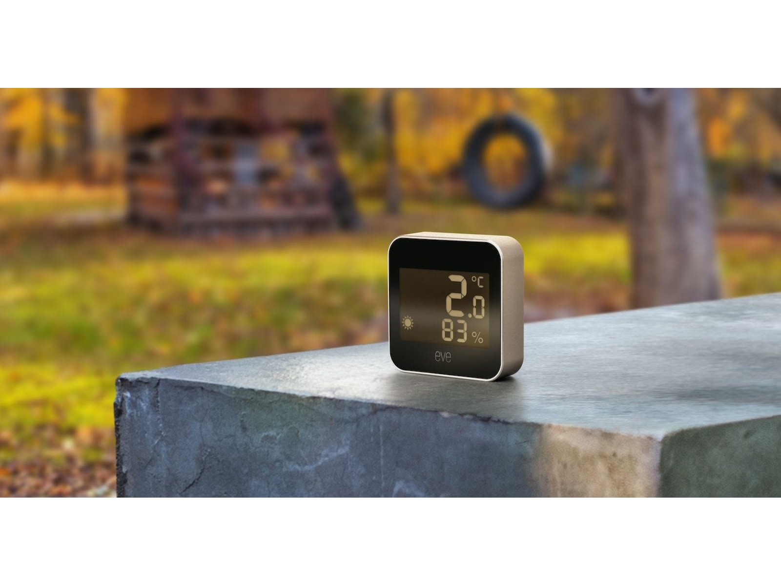 Med Eve Weather kan du spore din lokale utendørstemperatur, fuktighet og barometertrykk over tid, og se værtrenden på et øyeblikk – på din iPhone eller direkte på skjermen. Eve Weather har en slank, IPX4 vanntett design og fremtidssikker trådnettverksteknologi.
