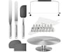 - Rett palettkniv - 20 cm lengde, vinklet palettkniv - 20 cm lengde, justerbar skjærer til sukkerbrød - 28 cm skjæretråd, silikonspatel - 33,5 cm lengde, roterende kakestativ - 28 cm diameter og 7,5 cm høyde