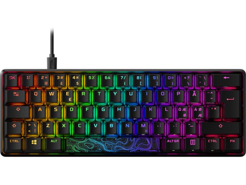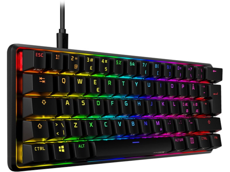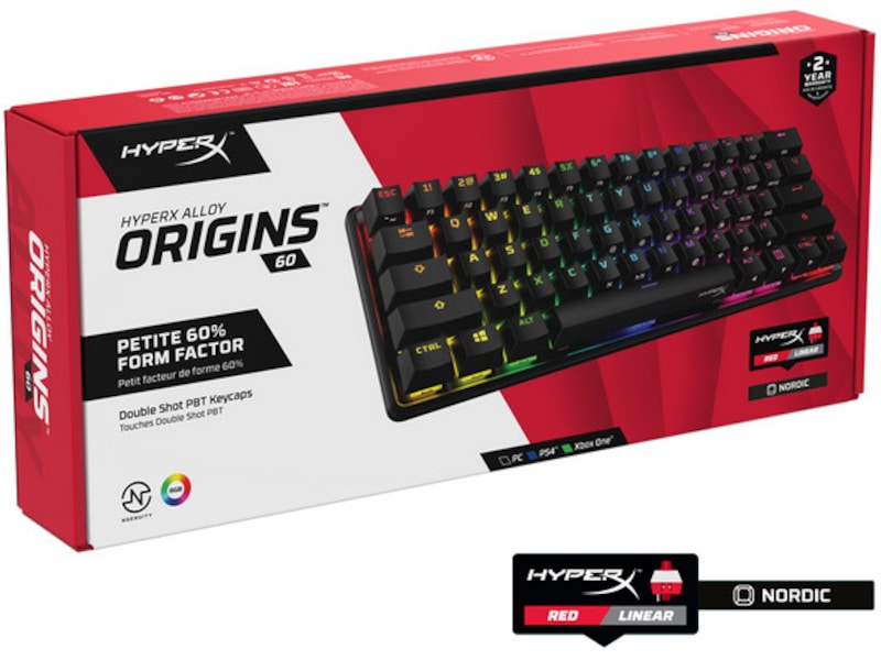 HyperX Alloy OriginsTM60 er et svært portabelt tastatur, som med formfaktor 60% gir deg mer plass til brede sveip med musen. Tastaturet i slitesterk, full aluminiums ramme har HyperX-taster som er balanserte for hastighet og ytelse, og er klassifisert til å tåle 80 millioner tastetrykk. Standard double shot PBT tastebryterhetter har sekundærfunksjoner trykket på siden så du kan enkelt finne funksjonene. Kast glans over stilen din med HyperX tastenes eksponerte LED lys, og fantastiske lyseffekter. Ta tilpasningen av tastaturet til et nytt nivå med makrofunksjoner, personaliserte belysningsprofiler og mer med HyperX NGENUITY programvare.