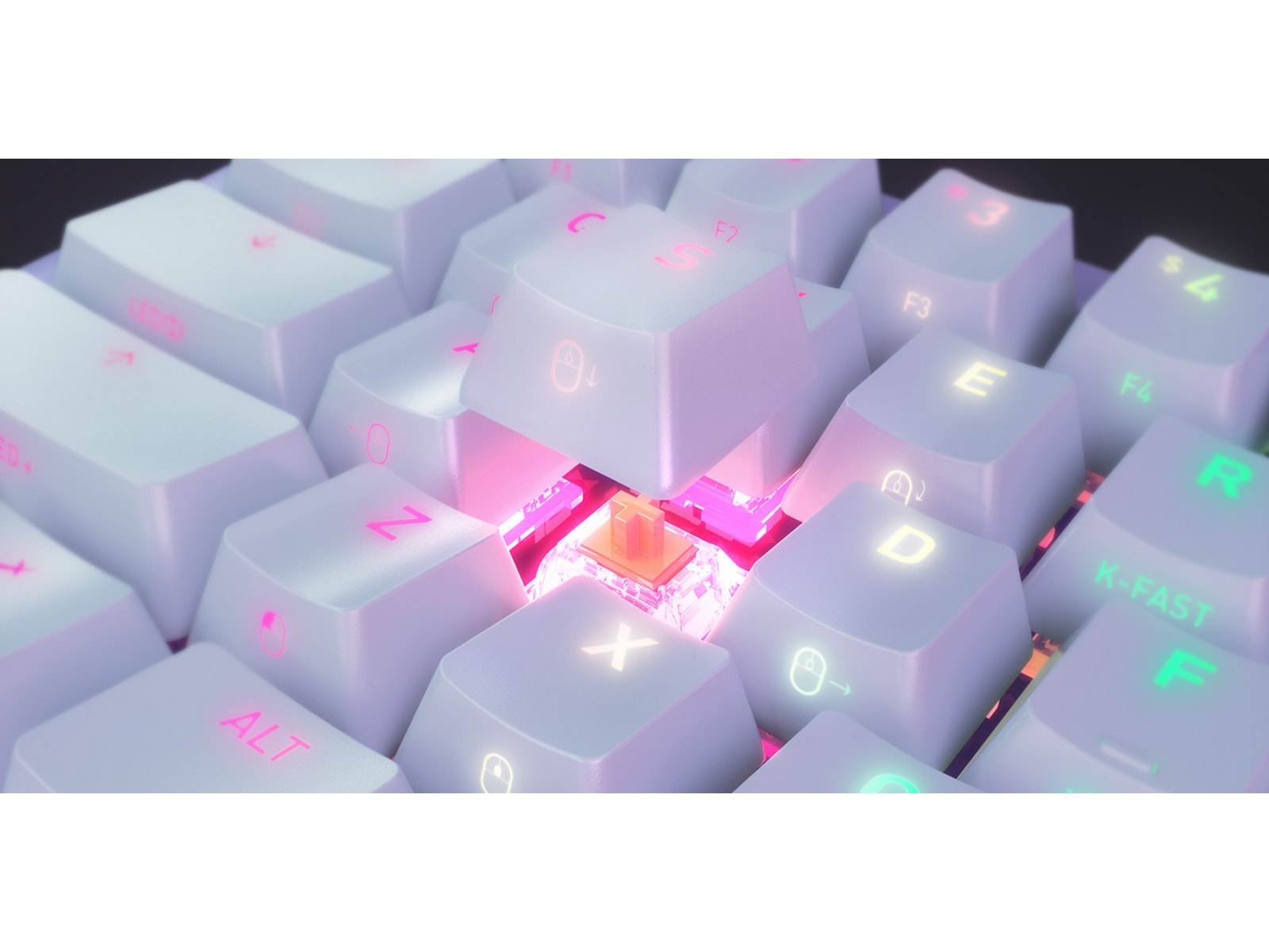 K5 leveres rett ut av esken utstyrt med Kailh Red mekaniske nøkkelbrytere, anbefalt av profesjonelle spillere for deres lette berøring, raske aktivering og holdbarhet på 70 millioner tastetrykk. Hvis du noen gang ønsker å bytte dem, kan de byttes ut ved hjelp av varme, slik at du enkelt kan erstatte dem med alle kompatible MX-brytere – ingen lodding nødvendig.