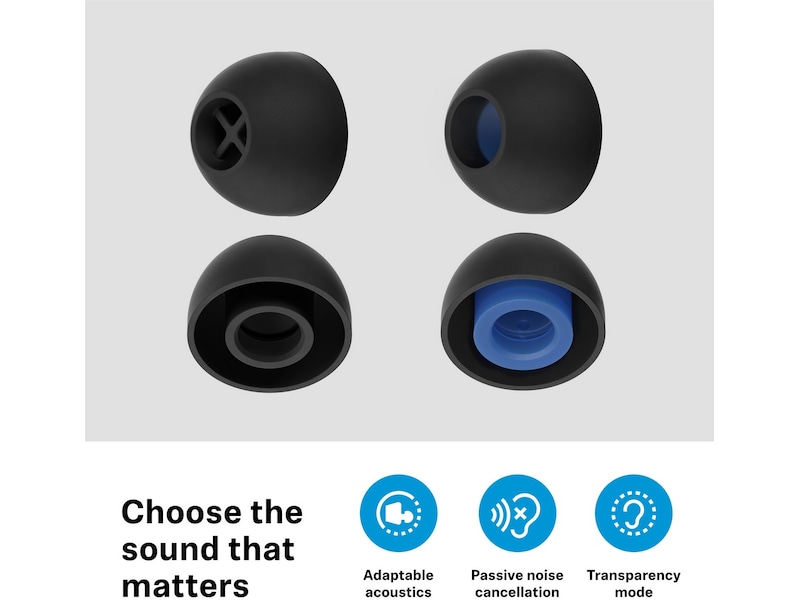 - Tilpassbar akustikk Åpne og lukkede øreadaptere for situasjonsbevissthet og passiv støykansellering