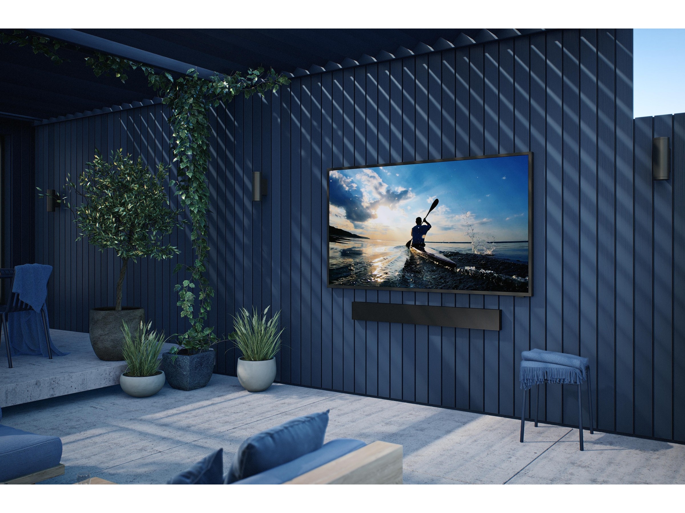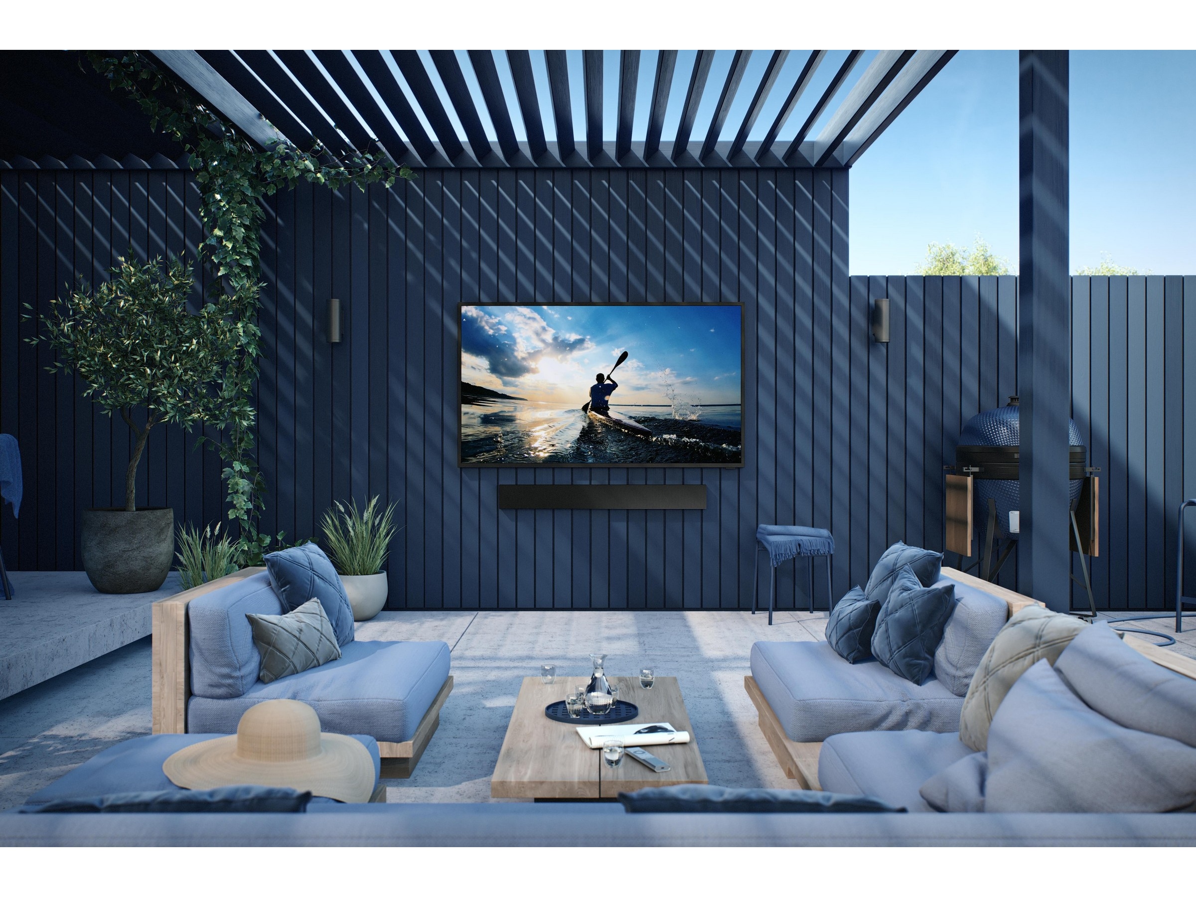 Værbeskyttet utendørs-TV (IP55*) utstyrt med QLED teknologi. Utviklet for deg som ønsker å se på TV samtidig som du hygger deg på uteplassen.