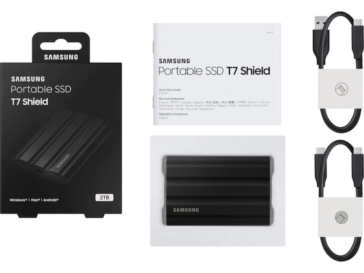 T7 Shield er kompatibel med PC, Mac, Android-enheter, spillkonsoller og mer*. Inkludert i esken er USB Type C-til-C- og Type C-til-A-kabler** for ekstra bekvemmelighet.