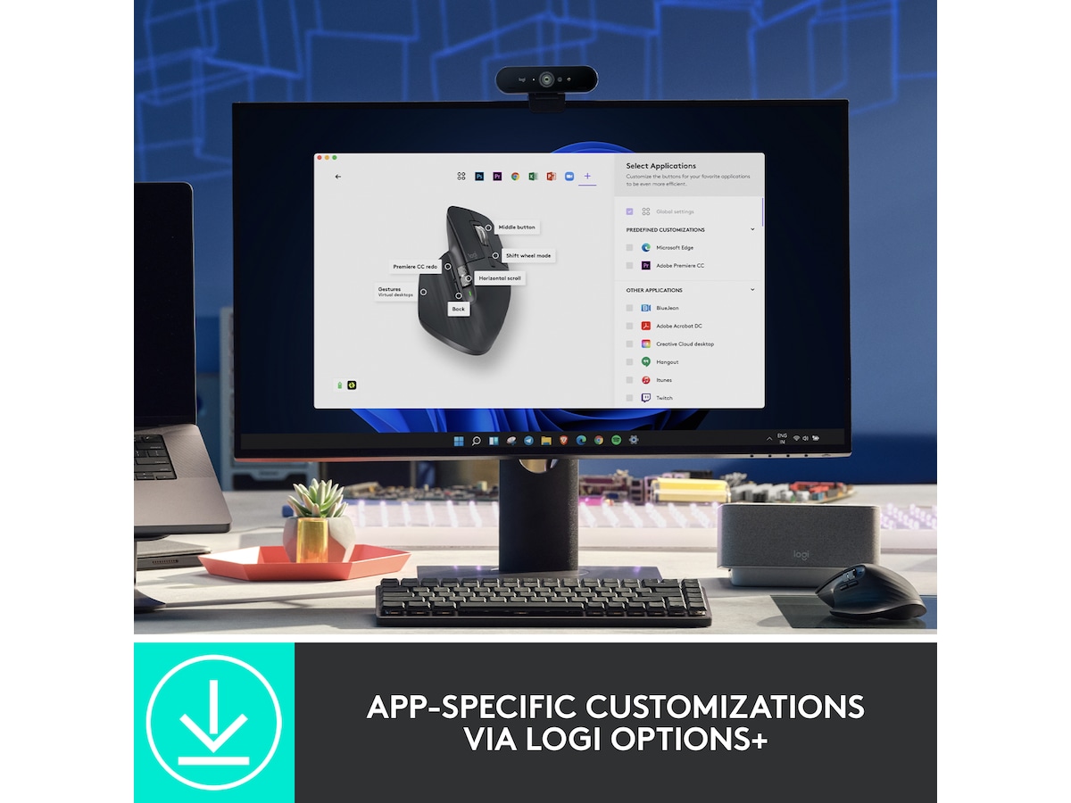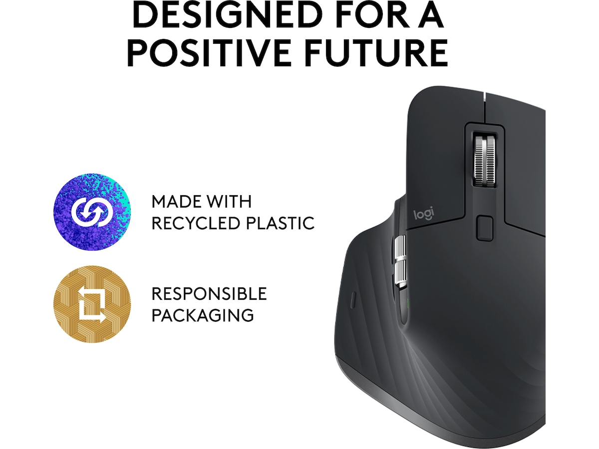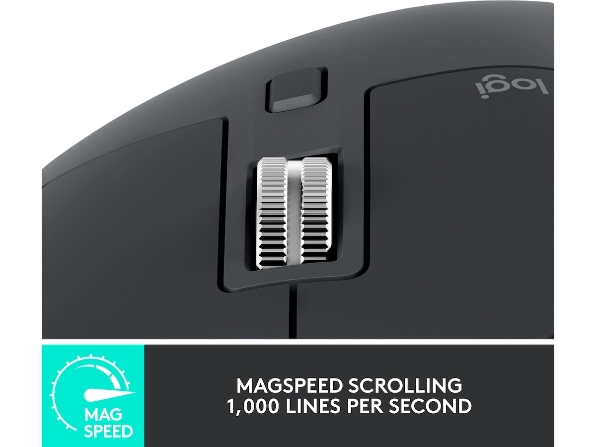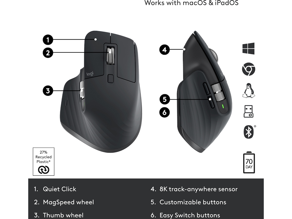 Tommelstøtte, Ladbart batteri, Håndbevegelsesfunksjon, Tommelhjul, Easy-Switch-teknologi, MagSpeed-hjul, Logitech Darkfield Laser Tracking, Quiet Clicks-teknologi, Tilpassbar DPI