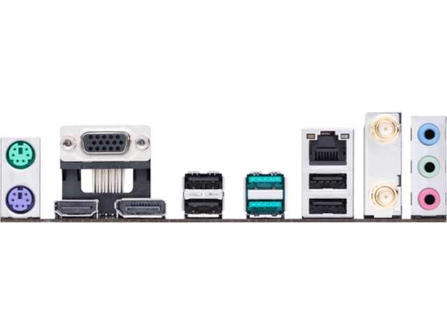 1. PS/2 2. HDMI®-port 3. D-Sub-port 4. DisplayPort 5. 2 × USB 2.0-porter (Type-A) 6. 2 USB 3.2 Gen 2-porter (Type-A) 7. Intel®1Gb Ethernet 8. 2 x USB 2.0-porter (Type-A) 9. V-M.2 (Key E) for Wi-Fi 10. 3 x lydkontakter 11. Utvidelsesspor ・1 x PCIe 4.0 x16 SafeSlot Core ・1 x PCIe 3.0 x1 12. 2 x AURA RGB-sokler