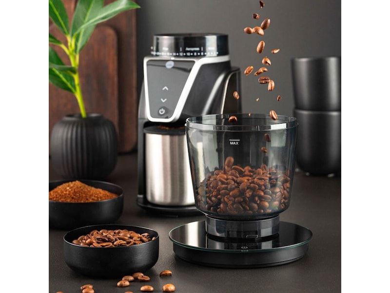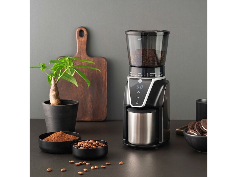 Bønnebeholderen er UV-beskyttet og er også utstyrt med en låsemekanisme som holder kaffebønnene i beholderen når du tar den ut av kaffekvernen. Det er perfekt hvis du for eksempel vil bruke bønnebeholderen din når du veier kaffebønnene.
