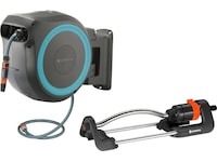 Den veggmonterte Slangeboksen RollUp M/L leveres med en veggbrakett, en 25 meter vanningsslange, en tilkoblingsslange, alle nødvendige GARDENA-systemdeler, og en dyse med to forskjellige spraystråler.