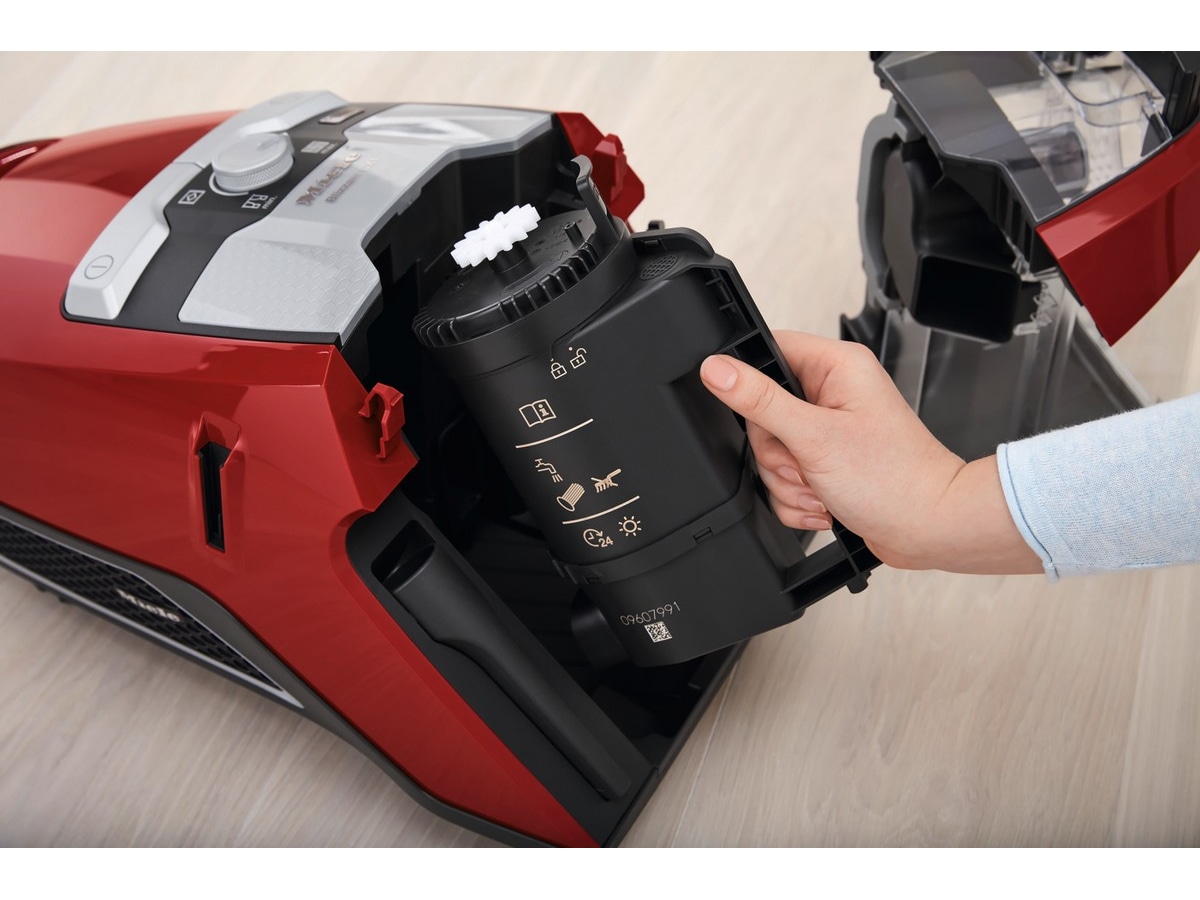 Vortex-teknologien skaper en enorm strømningshastighet på over 100 km/t. I kombinasjon med det svært tett utformede gulvmunnstykket og den gunstige luftføringen gir den poseløse støvsugeren enestående resultater. Grovt smuss og finstøv blir godt separert. Det grove smusset lander i den gjennomsiktige støvbeholderen, og finstøvet i en separat beholder med finstøvfilter.