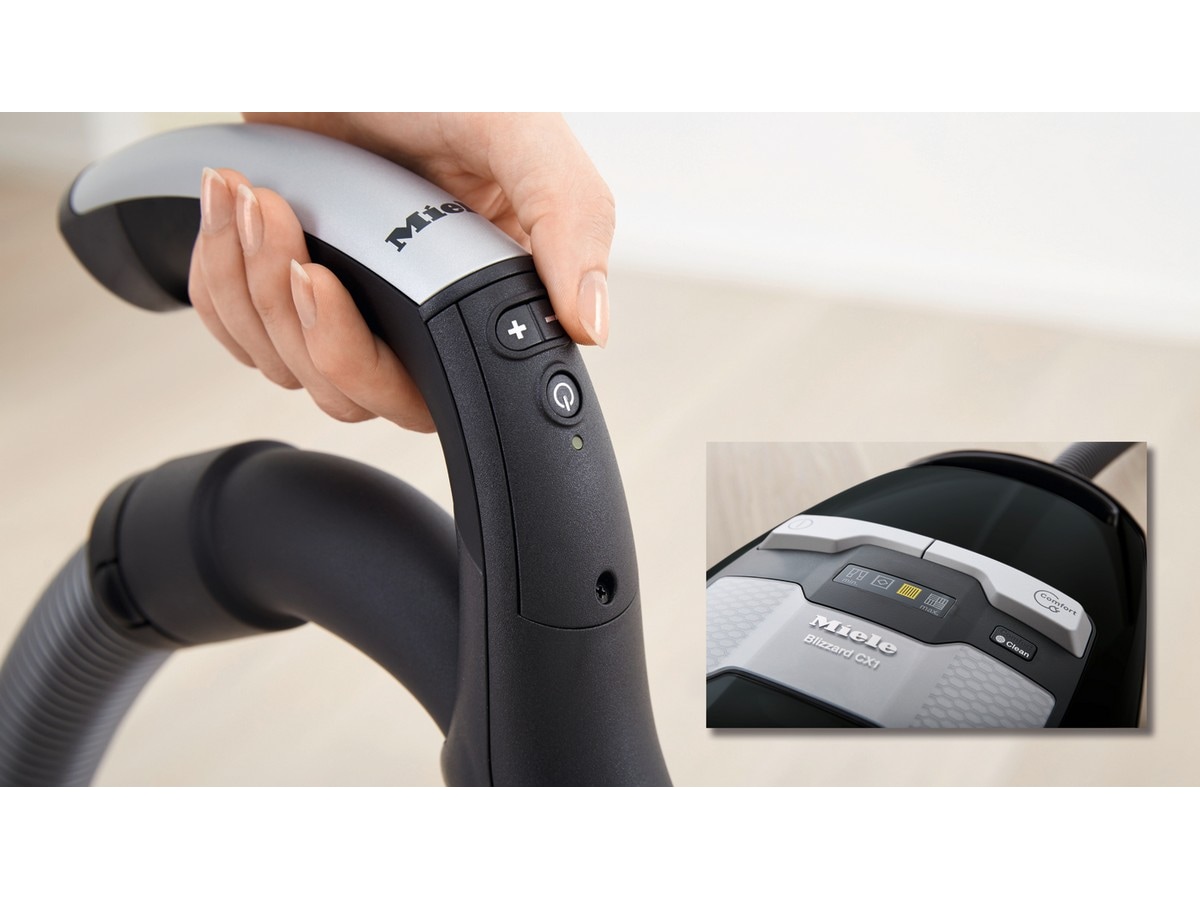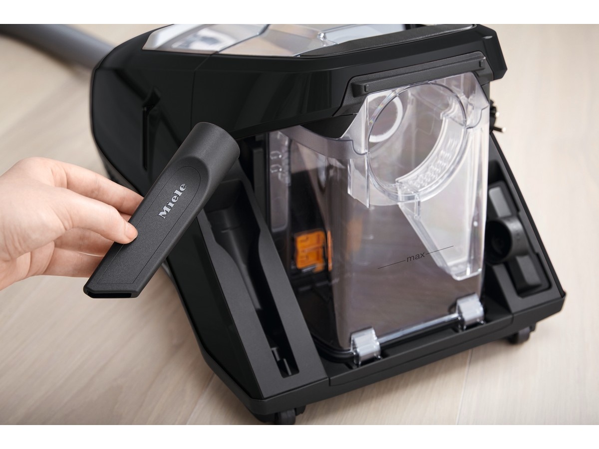 Standardutstyr for gulvstøvsugeren Miele Blizzard er tre sugemunnstykker av høy kavlitet: møbelmunnstykke og fugemunnstykke er integrert i støvsugeren. En sugebørste er integrert i Eco Comfort-håndtaket eller følger med separat.