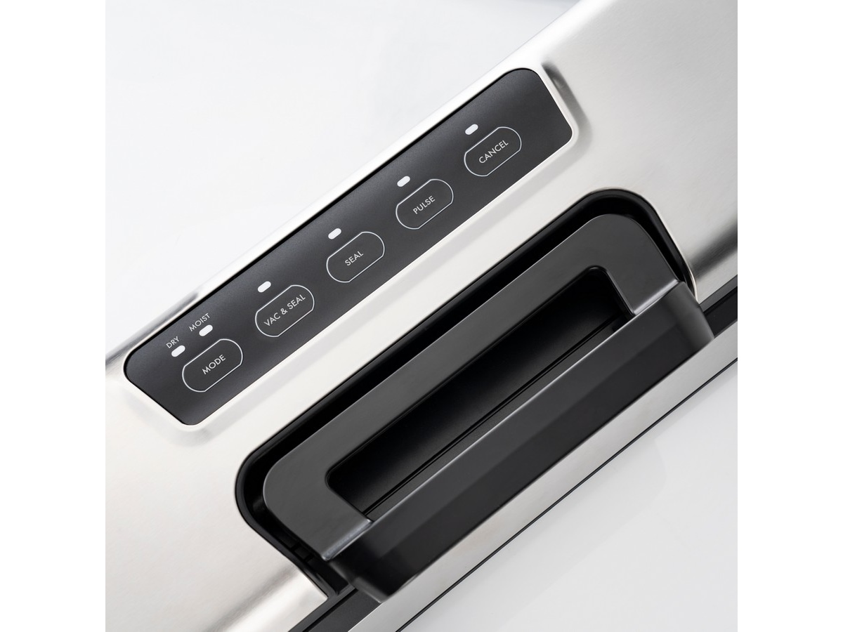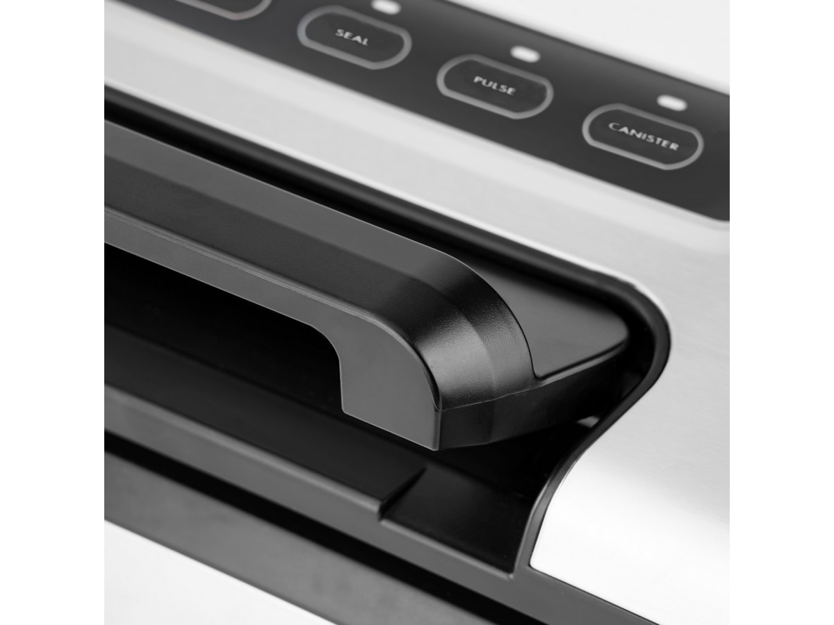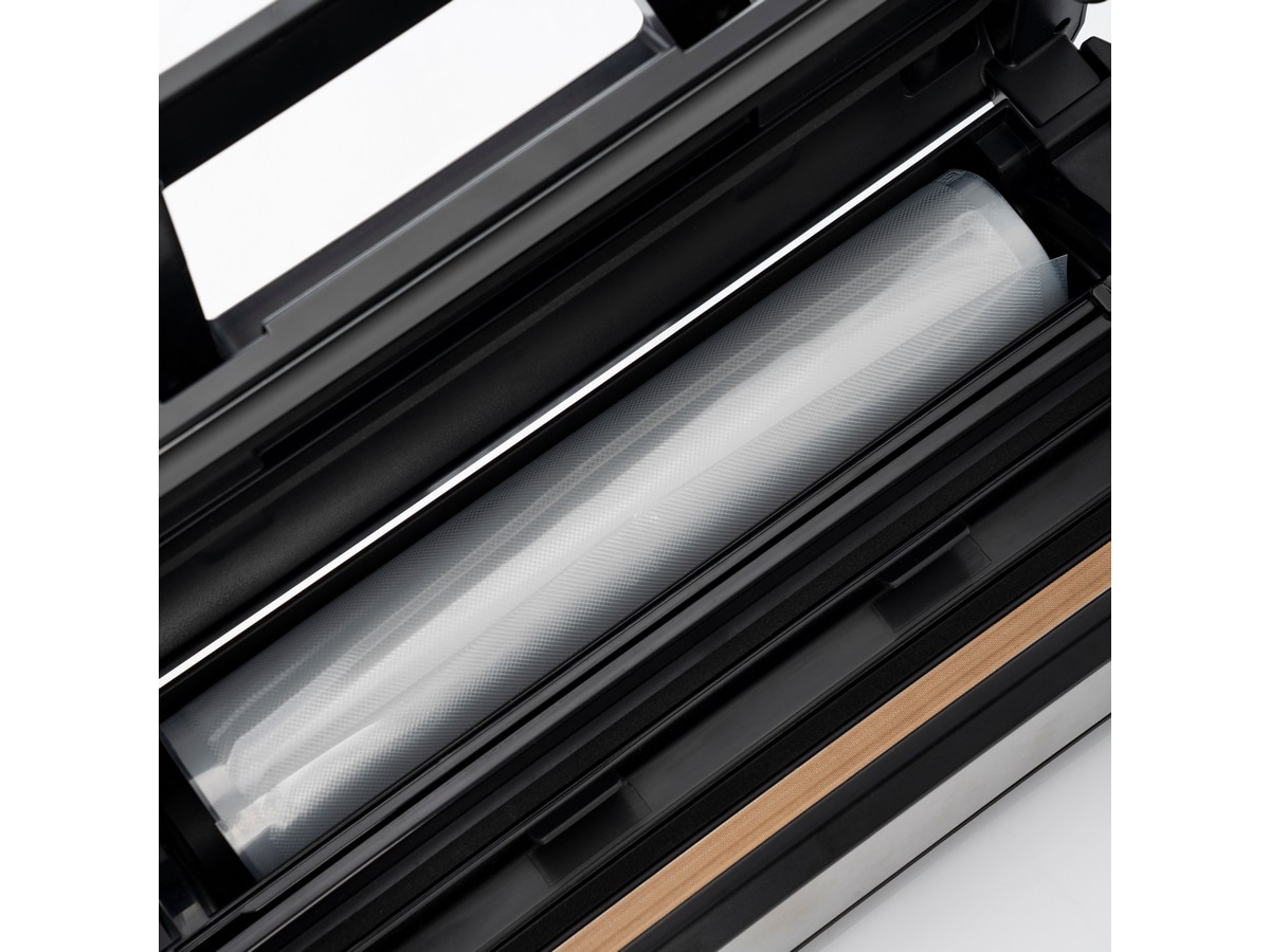 Den har også integrert oppbevaring for plastruller, slik at du alltid har vakuumplast for hånden og enkelt kan justere lengden etter behov. Du kan enkelt betjene maskinen med én hånd, feste posen med håndtaket og åpne maskinen når posen er forseglet. Det avtagbare brettet gjør den enkel å vaske opp og forhindrer at væske trenger inn i maskinen.