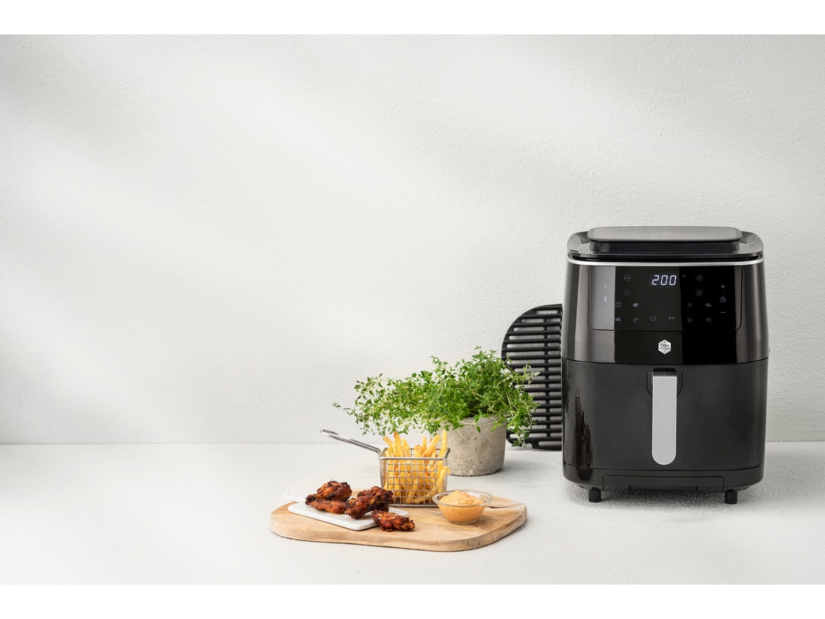Med en grillrist av aluminium får du de karakteristiske grillstripene på maten, og flere praktiske grilltilbehør følger med. Air fryeren har XXL-kapasitet på 6,5 liter og passer for en større familiehusholdning. Opptil åtte porsjoner kan tilberedes samtidig. Den har også mange ekstra funksjoner som gjør livet på kjøkkenet enklere, blant annet 60 minutters timer og alarm som varsler når maten er klar eller bør ristes.