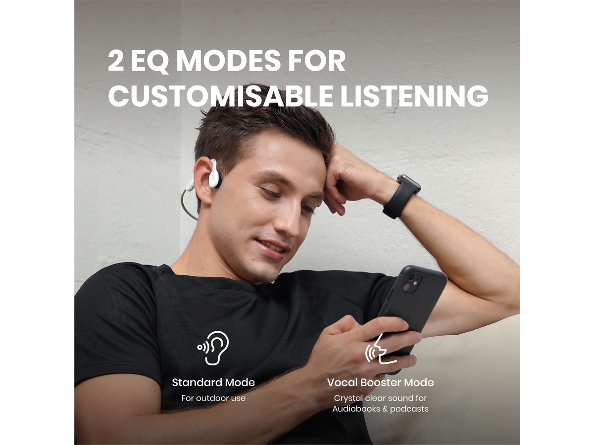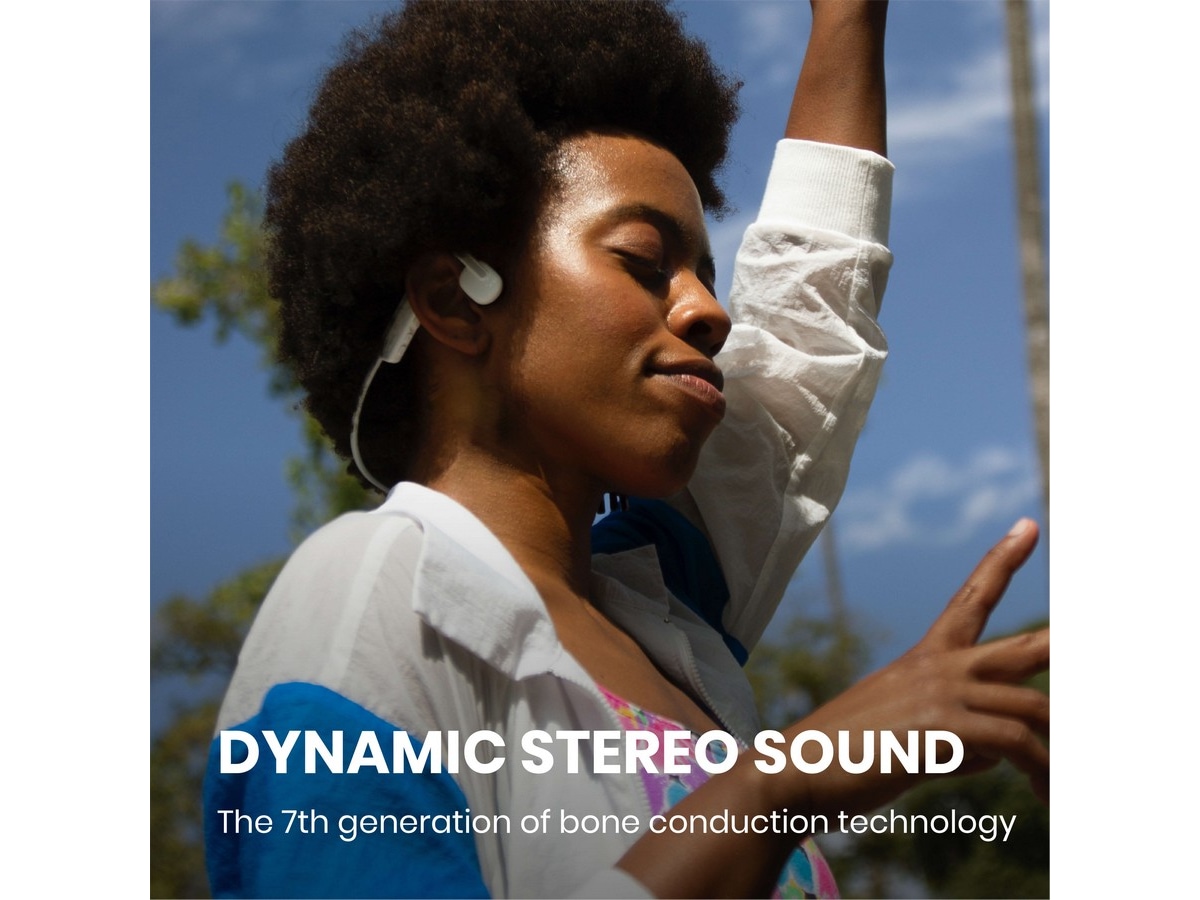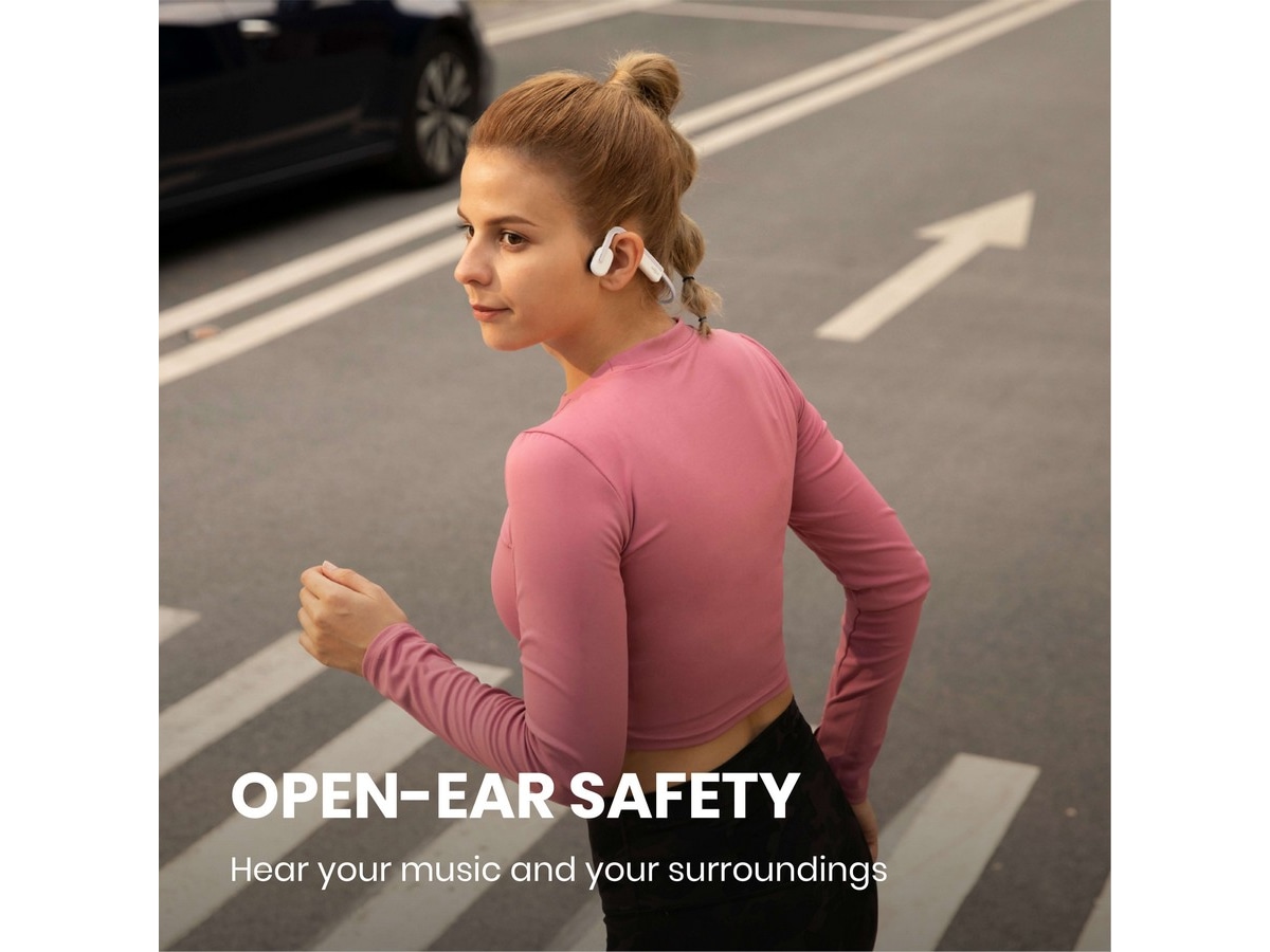 Vær oppmerksom på trafikksikkerheten når du er ute og går. Hodetelefonen er fullpakket med 7. generasjons beinledningsteknologi, slik at ørene dine forblir åpne for klar, stabil lyd og bevissthet om hva som skjer rundt deg. Det gjør den mye tryggere for deg når du løper eller sykler ute. Lytt uten å stenge omgivelsene ute.