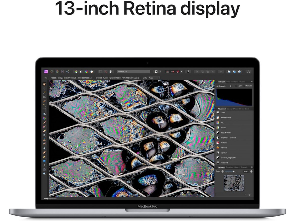 - 13,3-tommers Retina-skjerm med lysstyrke på 500 nit og stort fargerom (P3) gir sterke farger og et utrolig detaljnivå 3