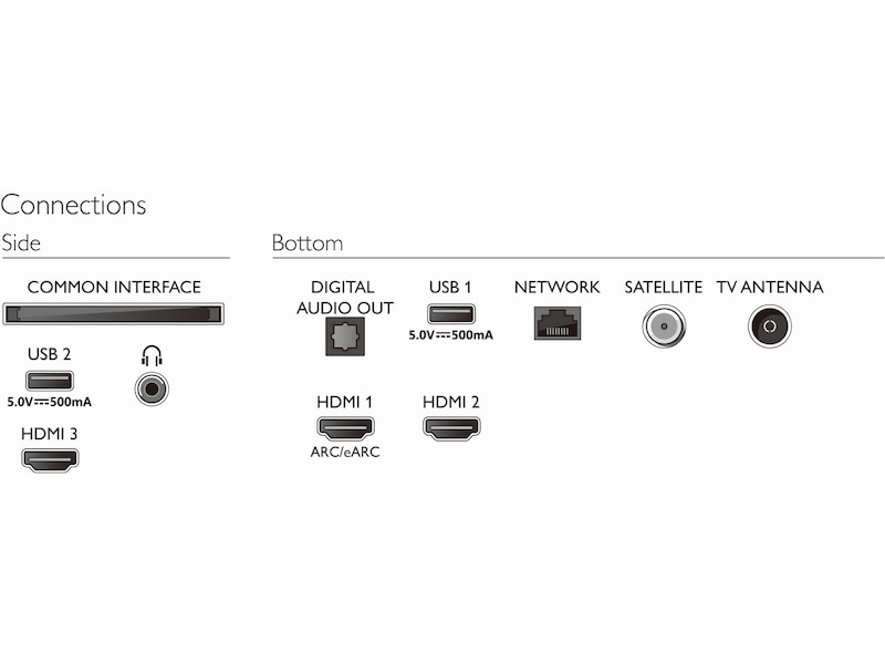 3 x HDMI, 2 x USB, LAN, Hodetelefoner, Digital lydutgang (optisk)