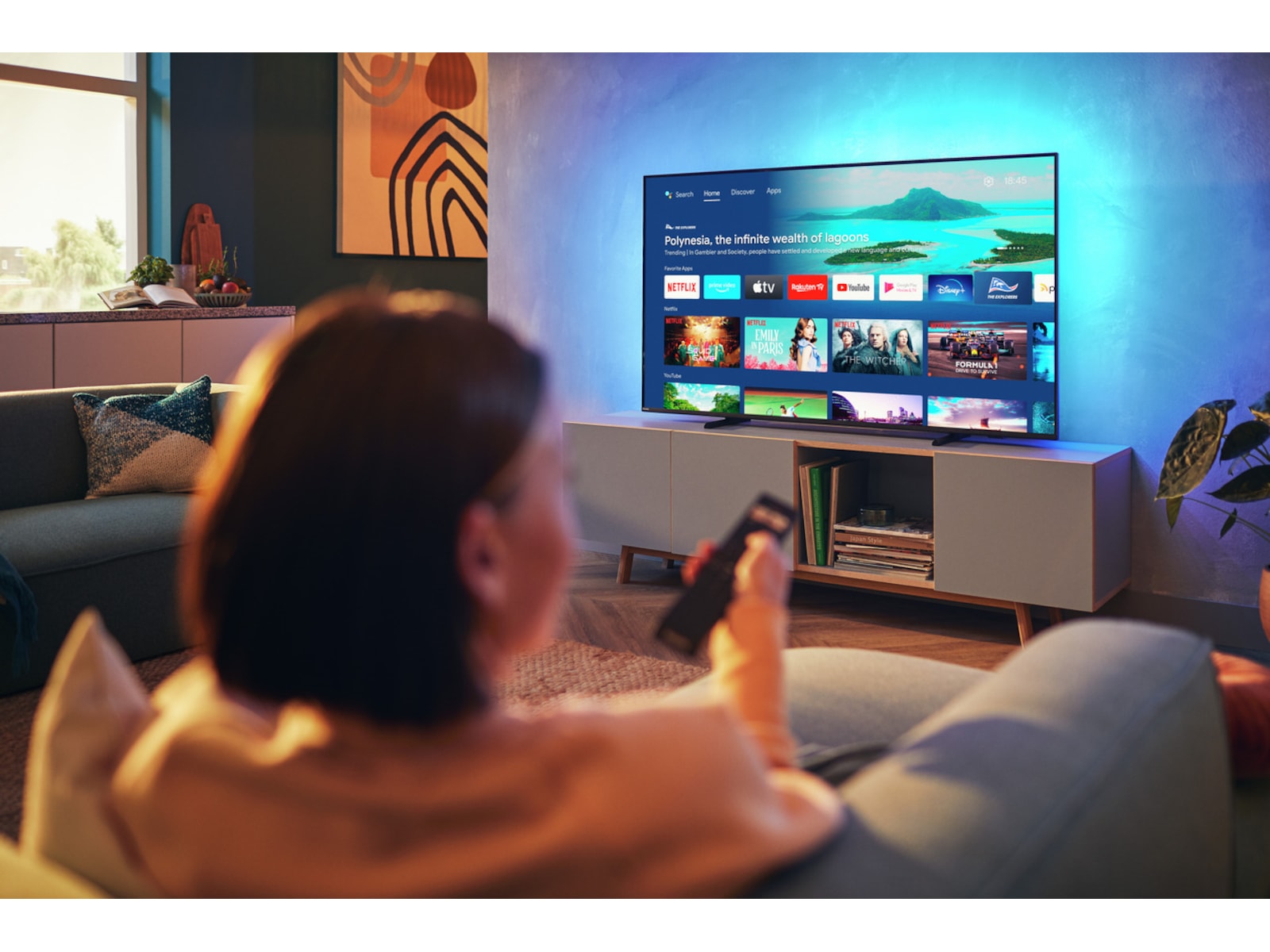 Få et skarpt, levende bilde, i tillegg til Dolby Atmos-lyd og jevn spilling. Denne AndroidTV-en er alltid til å stole på når du bare vil at alt skal se og høres flott ut. Ambilight gjør at alt du ser på eller spiller føles enda mer oppslukende.