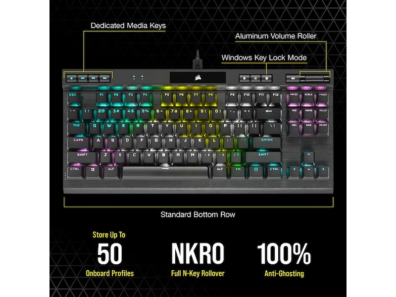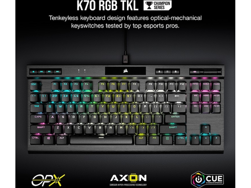 K70 RGB har en enestående ytelse med holdbarhet uten sidestykke og neste generasjons tastebryterteknologi på en bærbar og kompakt tenkeyless-design som er optimalisert med proff-funksjoner samtidig som den beholder kjernefunksjonaliteten.