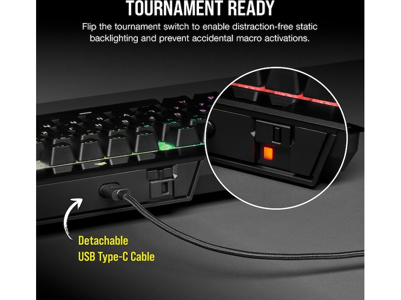 Vend turneringsbryteren for å låse distraksjonsfri bakgrunnsbelysning og deaktivere tilpassede makroer etter at du har koblet til den uttakbare flettede USB-C-kabelen.