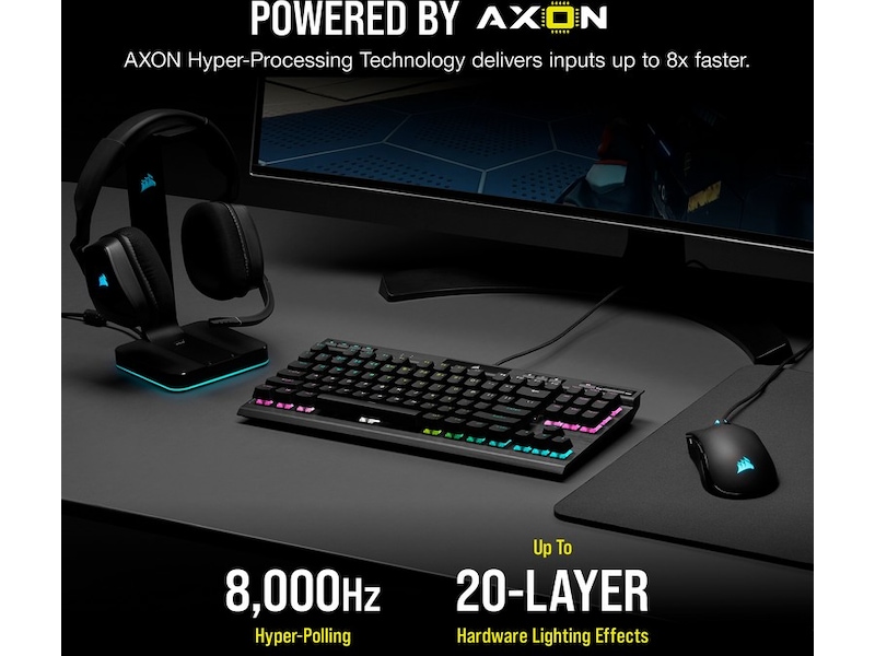 CORSAIR AXON Hyper-Processing Technology muliggjør CORSAIRs mest avanserte gaming-tastaturopplevelse med integrert 8000 Hz hyper-polling og 4000 Hz tastskanning, samtidig som den driver lyseffekter med 20 lag.