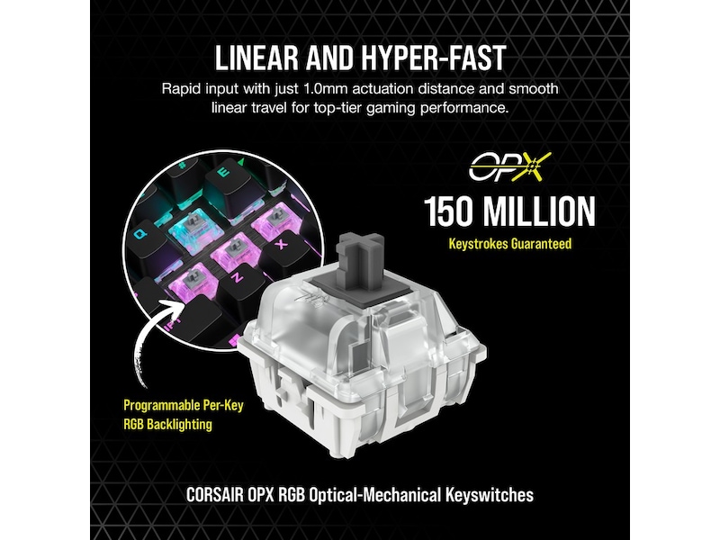 De eksklusive CORSAIR optisk-mekaniske tastebryterne er stilige, utrolig pålitelige og vanvittig raske og er designet for enestående spillytelse. De leverer tastetrykk med en utrolig hastighet og en aktiveringsdistanse på 1,0 mm uten signalfluktuasjoner og med jevn lineær flytting.