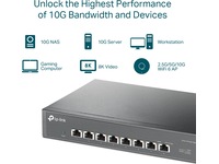 Som et 10G-produkt på flaggskipsnivå er TL-SX1008 en 8-ports 10G svitsj montert på skrivebord/rack som leverer en svitsjkapasitet på opptil 160 Gbps. Automatisk forhandling med 5-trinns (100Mbps/1G/2.5G/5G/10G) tilkoblinger oppdager koblingshastighetene og justeres på en intelligent måte for kompatibilitet og optimal ytelse for alle enheter, inkludert 10G NAS, 10G-server, arbeidsstasjon, gamingmaskin, 2.5G /5G/10G WiFi 6 AP, 8K video, stasjonære maskiner og mer.