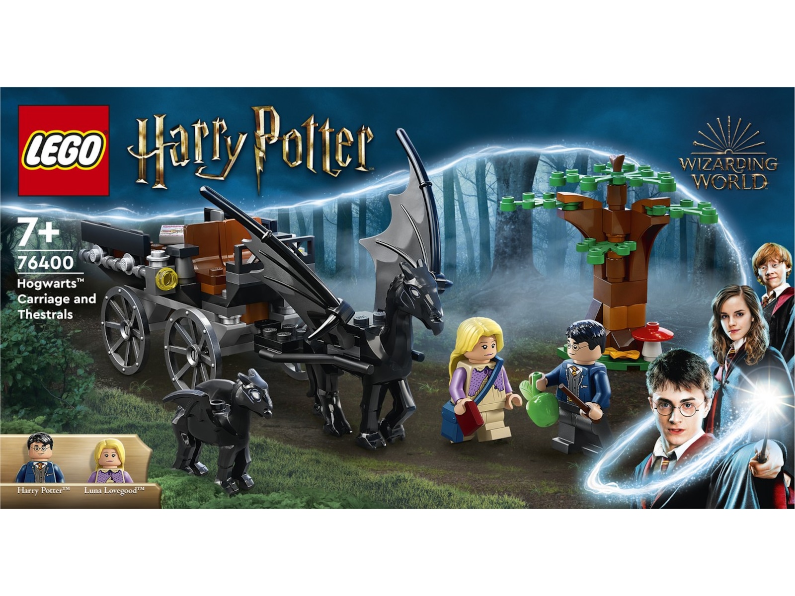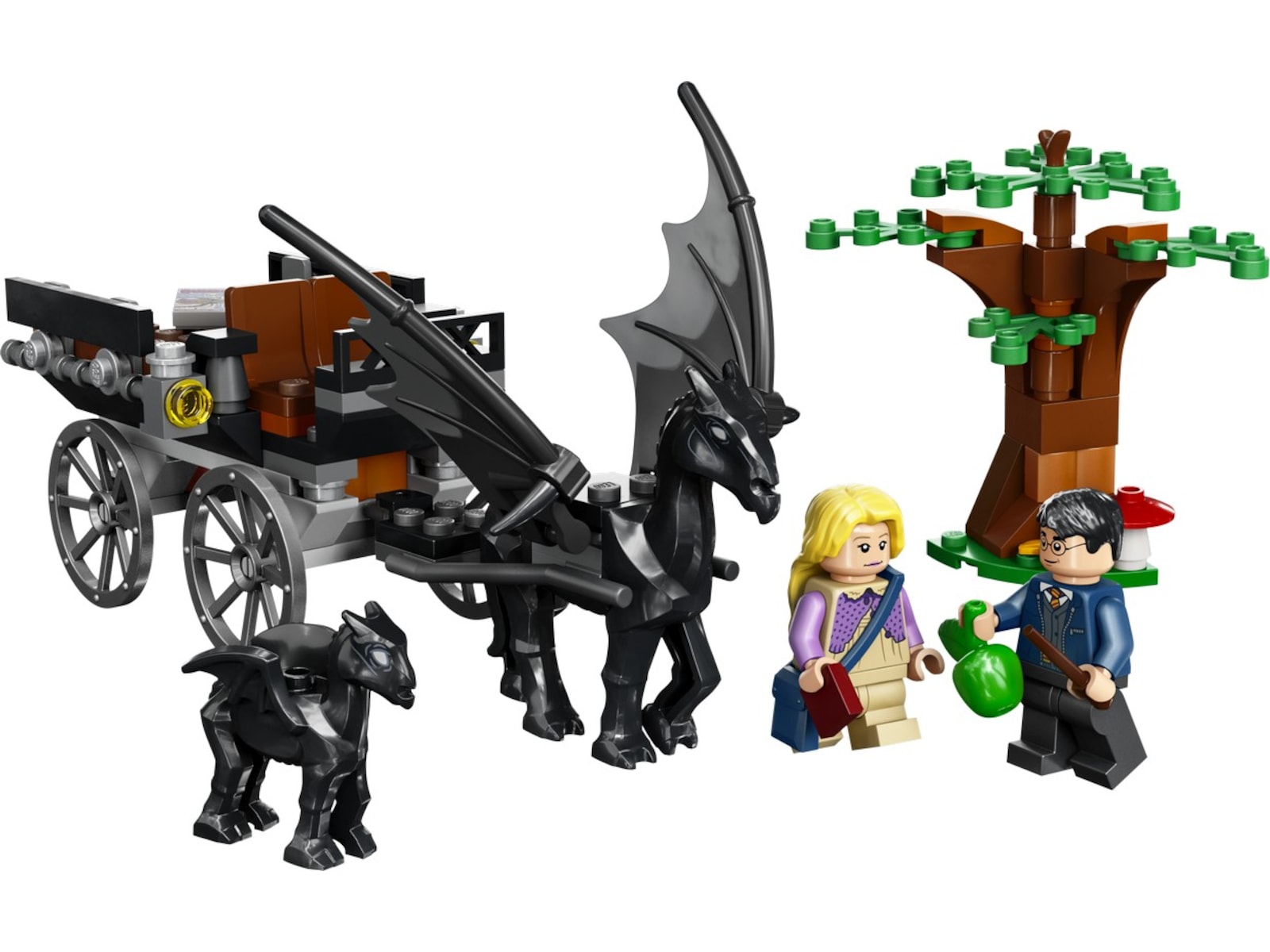 - Ikoniske figurer – inkluderer minifigurer av Harry Potter™ og Lulla Lunekjær, en voksen dystral og en dystralunge samt en byggbar vogn som kan trekkes av den voksne dystralen