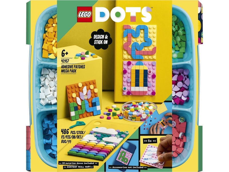 Med Megapakke med selvklebende merker kan du feste designmønstrene dine hvor du vil! Legg de selvklebende 8x8 LEGO® DOTS merkene på underlaget, skap unike og egendesignede mønstre med de fargeglade flisene og fest dem på et hardt og jevnt underlag. Finn inspirasjon i boksen, eller slipp kreativiteten løs og vis alle hva du kan! Er du klar for noe nytt? Du kan når som helst endre mønsterdesignen din!