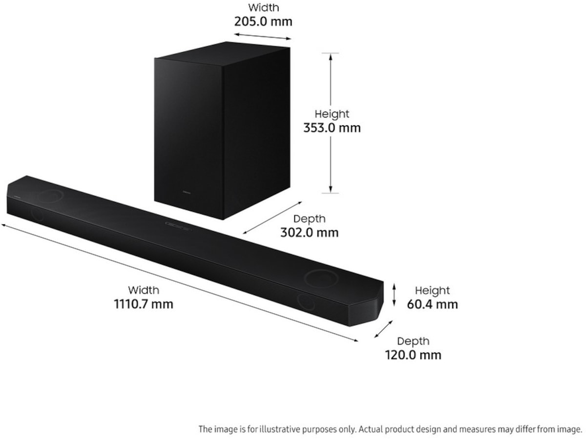 Subwoofer: 20.5 cm x 30.2 cm x 35.3 cm / 5.9 kg, Lydbjelke: 111.07 cm x 12 cm x 6.04 cm / 4.8 kg
