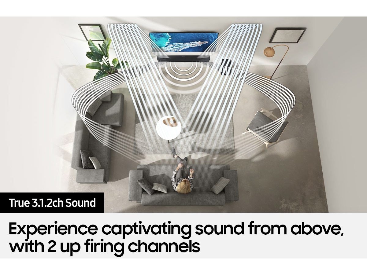 Objektbaserte Dolby Atmos-lydformater integreres nå for første gang trådløst med Samsung Soundbar. Opplev synergieffekten som skapes av 3D-lyden fra Dolby Atmos-innhold og Samsung Soundbar – helt uten kabler.