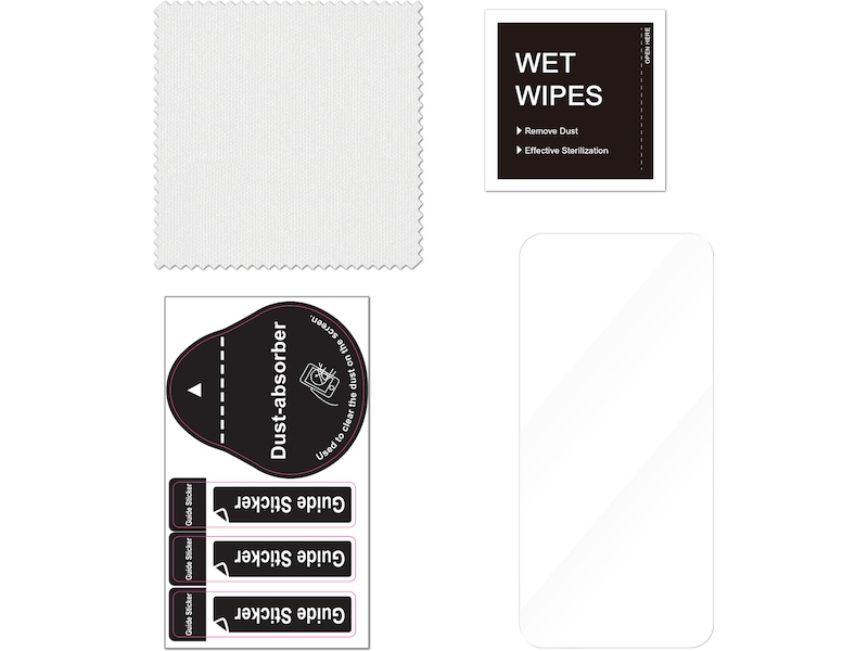 Pakkeinnhold Støvfjerningsetikett, Rengjøringsklut, Skjermbeskyttelse, Føringsklistremerker, Våte renseservietter