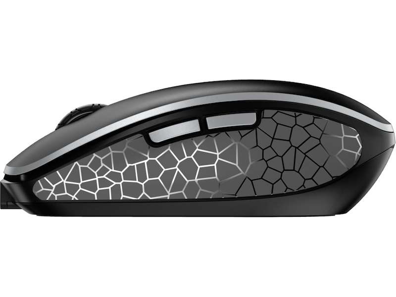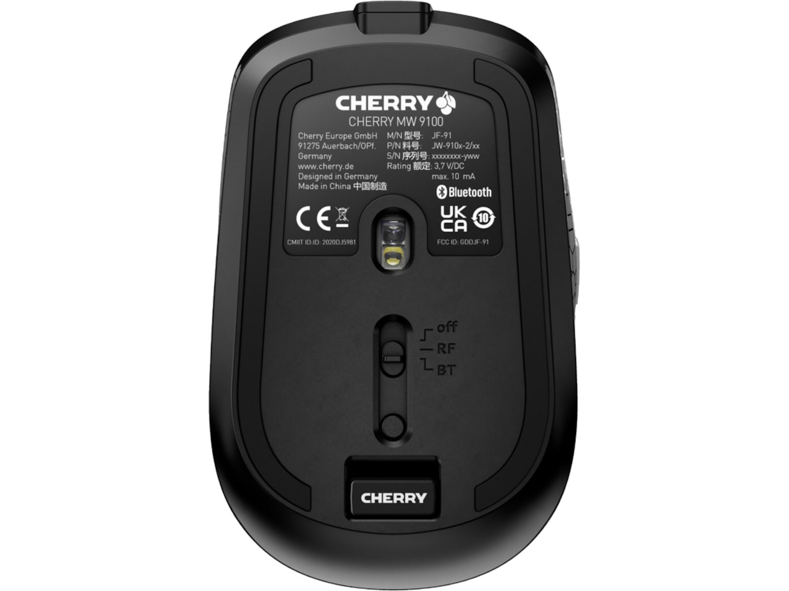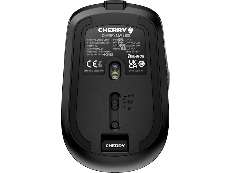 MW 9100 kan kobles til enheten din ved hjelp av Bluetooth eller radiomottakeren på 2,4 GHz. Ved hjelp av skyvebryteren på bunnen av den trådløse musen kan du enkelt bytte mellom begge tilkoblingsmodusene. I begge tilfeller utføres overføringen ved hjelp av AES-128-kryptering. Når du er på farten, bør du oppbevare CHERRY MW 9100 i transportvesken (inkludert). USB-mottakeren oppbevares magnetisk inni musen.