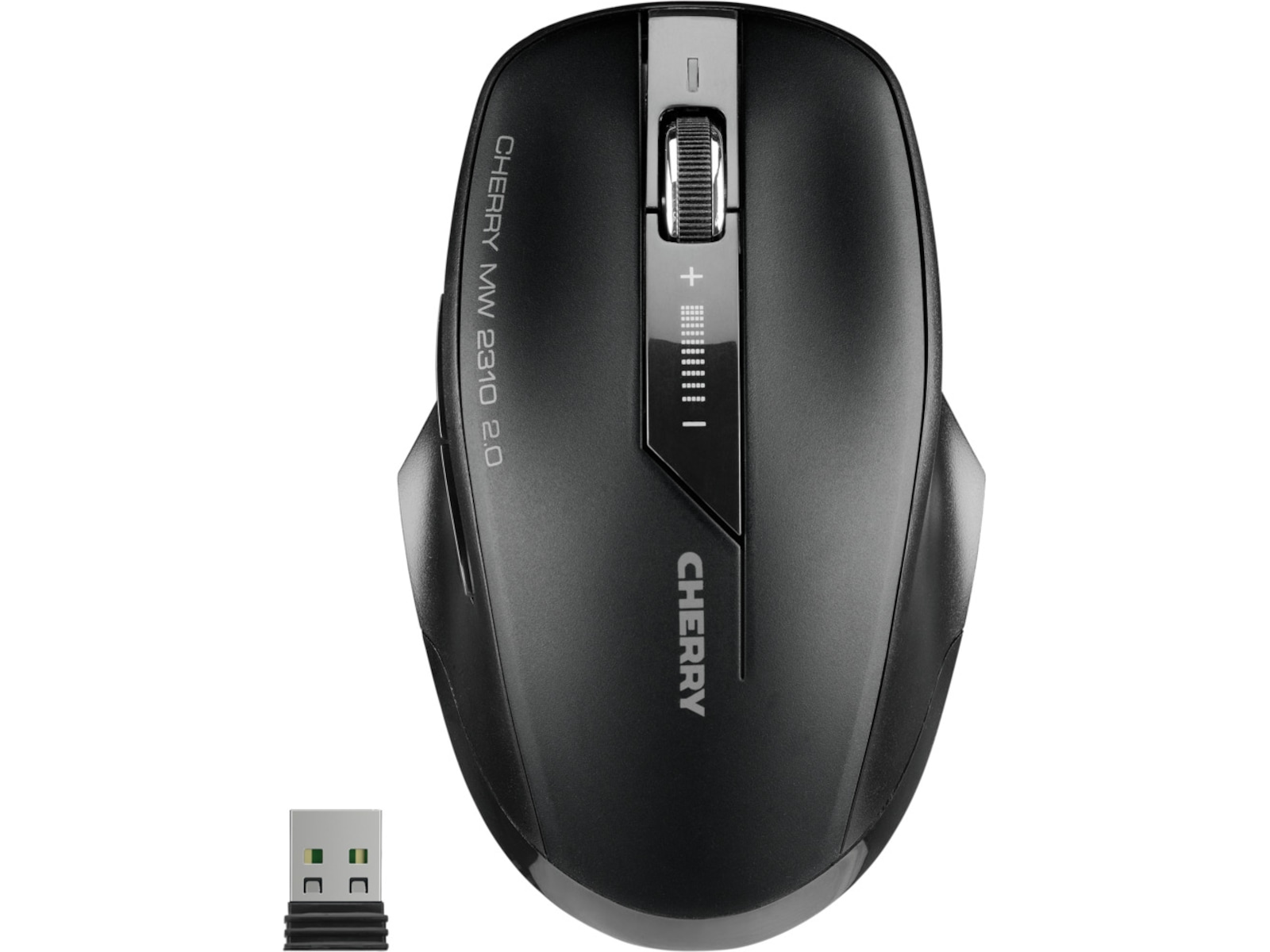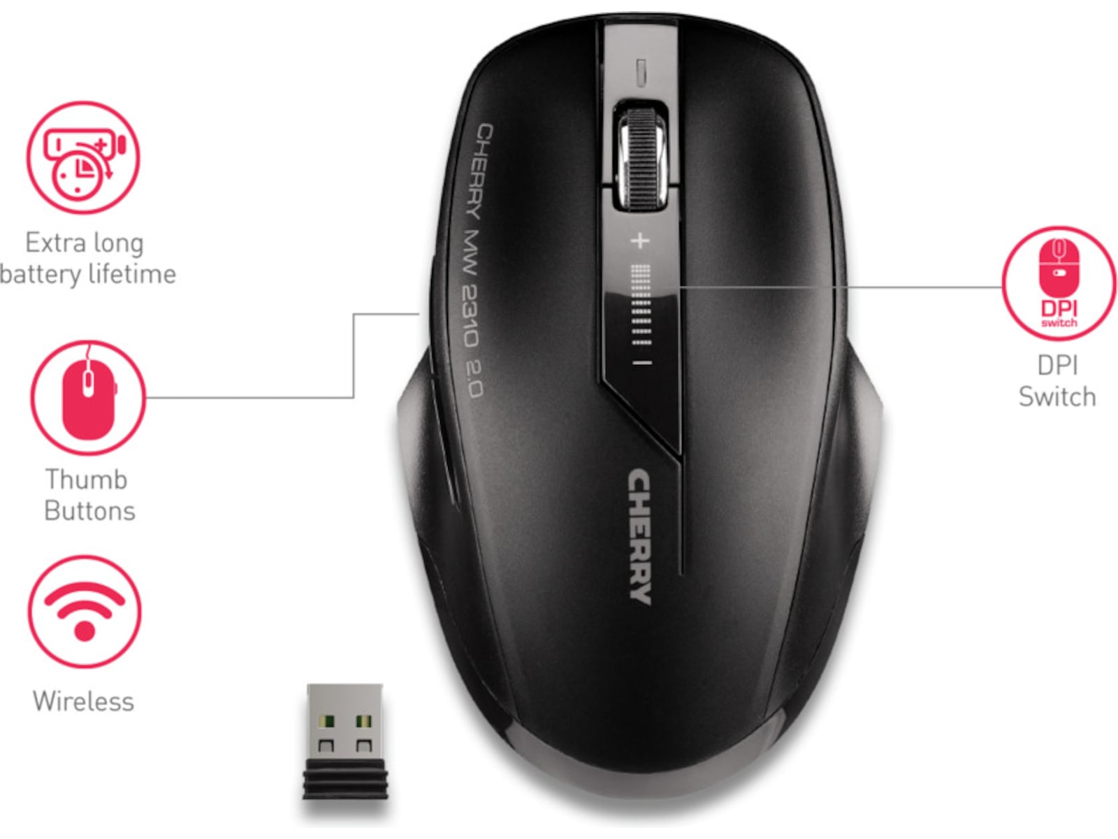 CHERRY MW 2310 2.0 er en allsidig trådløs mus med 6 knapper med 2,4 GHz-teknologi og en ergonomisk design. Nano USB-mottakeren er så liten at den trygt kan holde seg inni laptopen, selv når du er på farten – musen er alltid klar til bruk. CHERRY MW 2310 2.0 har en optisk sensor med 3 justerbare oppløsninger (1000/1600/2400 DPI). Ved hjelp av DPI-bryteren på toppen av musen kan du velge oppløsning med et knappetrykk. Et LED-lys indikerer hvilket DPI-nivå som er valgt.