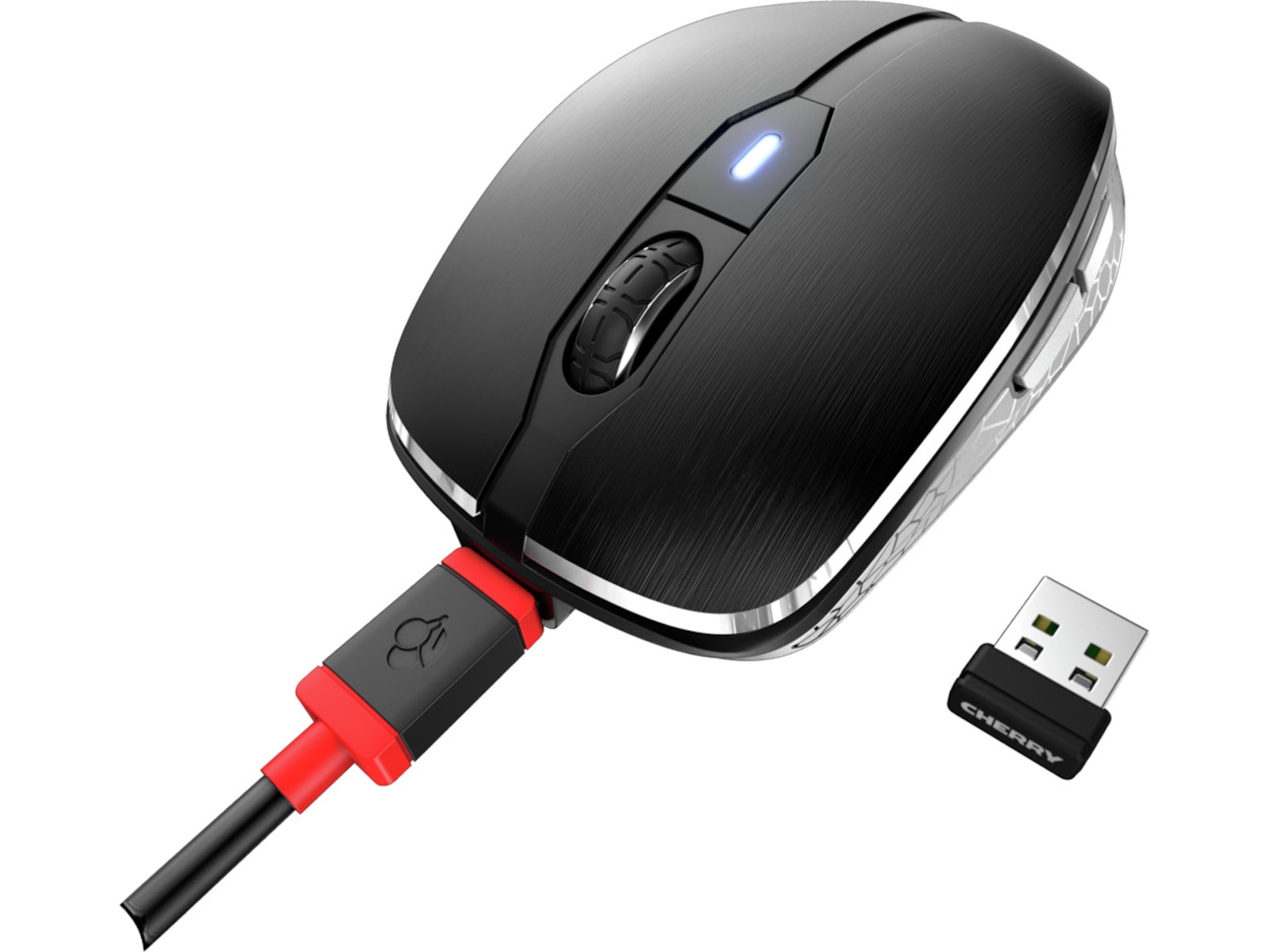 I motsetning til andre konvensjonelle mus, kan CHERRY MW 8 ADVANCED kobles til enten ved hjelp av den medfølgende 2,4 GHz trådløse USB-mottakeren eller via Bluetooth®. Du kan raskt bytte tilkoblingstype ved hjelp av en bryter nederst på musen. Dette gjør at for eksempel en bærbar PC kan kobles til via Bluetooth® og en PC kan kobles til via en vanlig trådløs tilkobling, og begge kan betjenes med den samme musen. Bare trykk på bryteren for å veksle mellom de to enhetene.