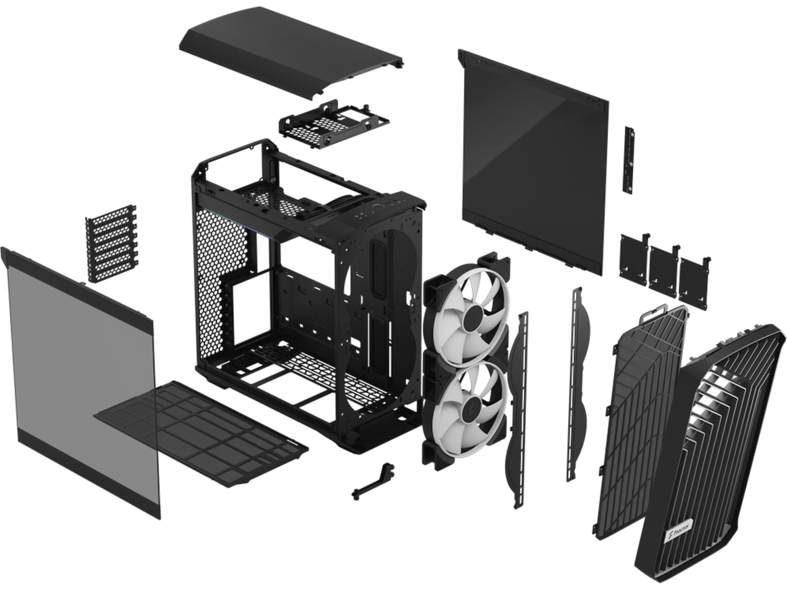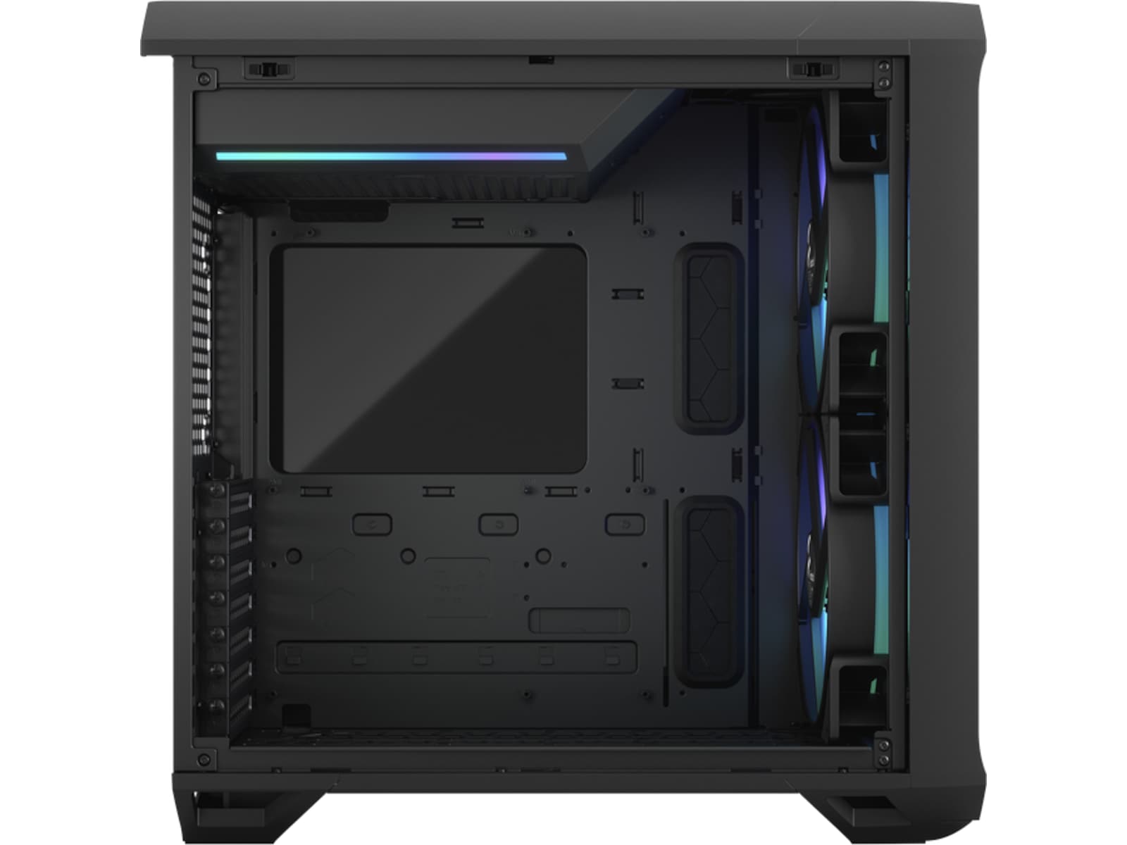 • Med et mATX-hovedkort (eller mindre) montert kan de to 180 mm-viftene på fronten flyttes til bunnen av kabinettet, noe som gir mulighet for støtte for radiatorer på fronten og enestående GPU-kjøling