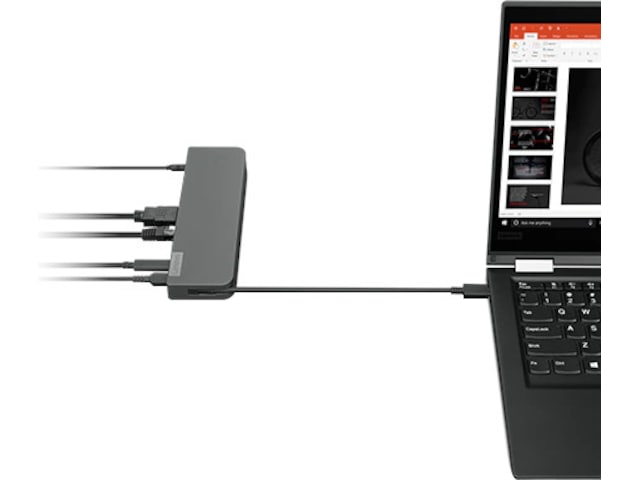 Utvid potensialet ditt med en Universal Mini Dock; Lenovo forstår at moderne bedrifter er avhengig av et bredt spekter av PC-typer og til og med merker for å oppfylle sine forretningsbehov. For å gjøre dette enklere kan Lenovo USB-C Mini Dock brukes med bærbare maskiner fra både Lenovo, HP og Dell.**