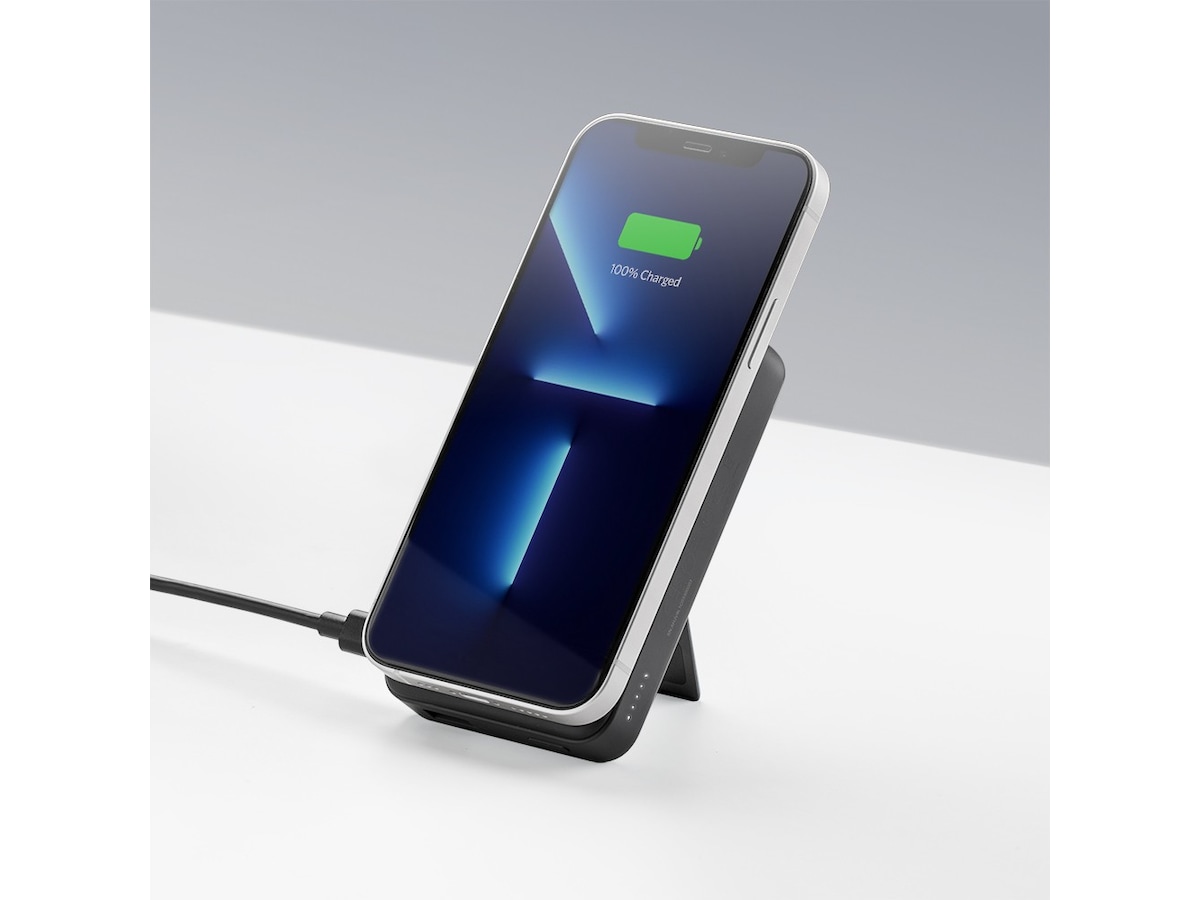 Den hendige bærbare laderen lader telefonen din enkelt, mens det sammenleggbare stativet gir stabil håndfri bruk av telefonen.