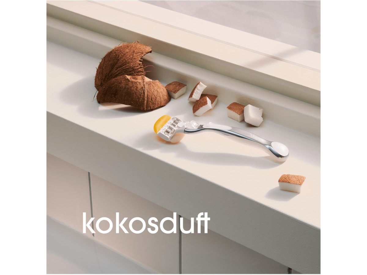 - MINDRE TØRR HUD: barberhøvelen har fuktighetsgivende Olay komfortbånd med en diskré kokosduft som holder på fuktigheten, slik at huden ikke tørkes ut. Myk og silkeglatt hud i dagevis