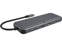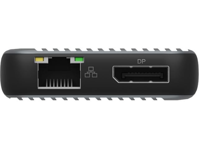 Den hendige dokkingstasjonen håndterer ikke bare én skjerm med 8K-oppløsning på 30 Hz, men tre samtidig. Videotilkoblinger gjøres via to HDMI- og en DisplayPort-tilkobling. En forutsetning er at vertsdatamaskinen støtter DisplayPort Alt-modus.