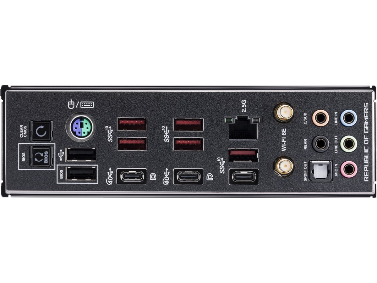 Grensesnitt 1 x lydutlinje (senter/subbasshøyttaler) - minijakk, 1 x mikrofon - minijakk, 1 x lydutlinje (bakre) - minijakk, 1 x LAN (2.5Gigabit Ethernet), 2 x USB4/DisplayPort, 1 x PS/2-tastatur / -mus, 5 x USB 3.2 Gen 2, 1 x USB-C 3.2 Gen 2, 1 x lydutlinje - minijakk, 2 x USB 2.0, 1 x SPDIF-utgang, 2 x antenne, 1 x lydinnlinje - minijakk