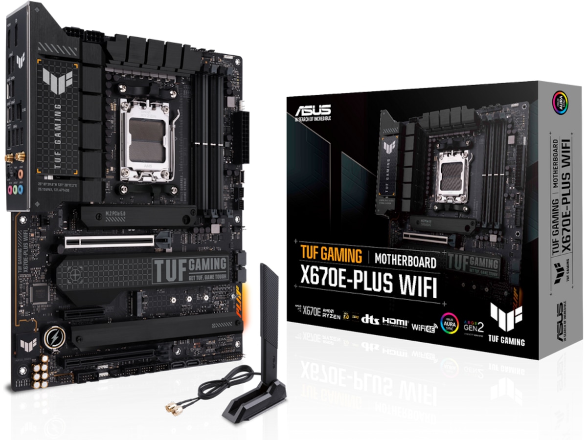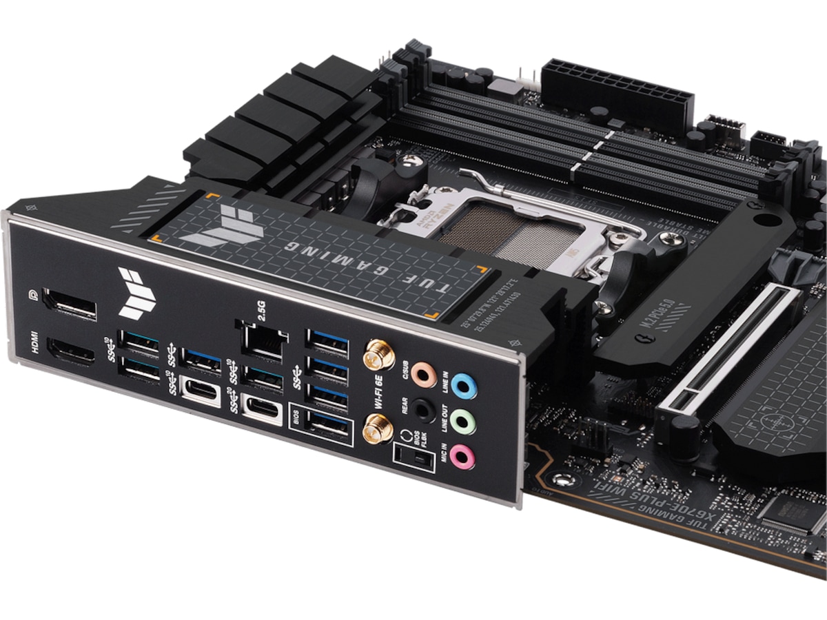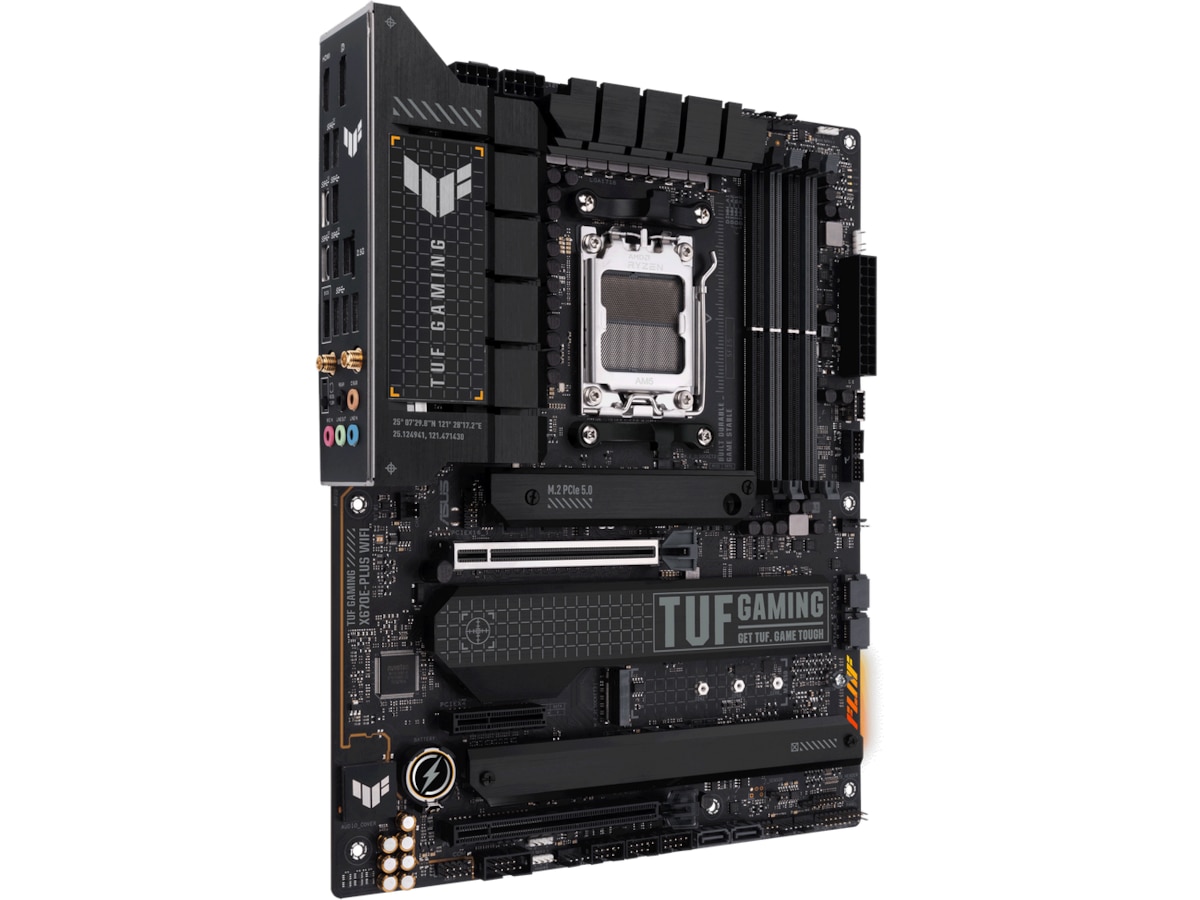 TUF-GAMING X670E-PLUS når nye ytelseshøyder med den seneste versjonen av PCI Express, mens et arsenal av USB-porter inkluderer tre Type-C®-porter og Thunderbolt 4 utvider kompatibilitet og båndbredde ytterligere.