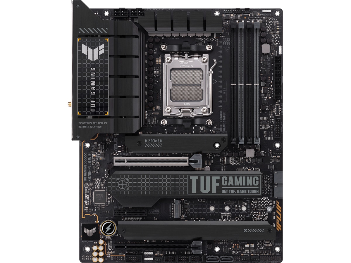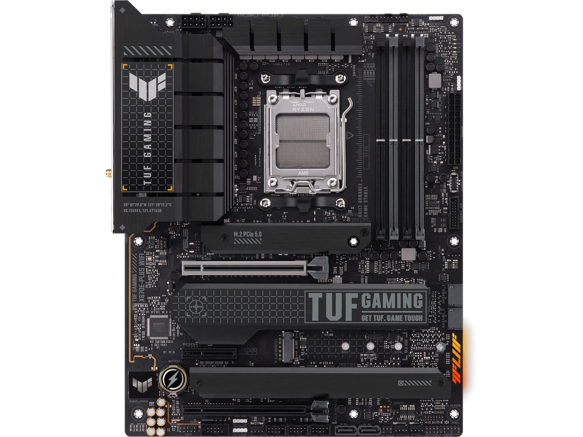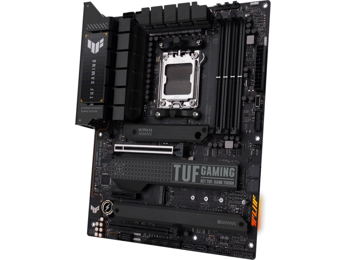 ASUS TUF GAMING X670E-PLUS tar alle de essensielle elementene fra de seneste AMD-prosessorene, og kombinerer dem med spillklare funksjoner og anerkjent holdbarhet. Med slitesterke komponenter, en oppgradert strømløsning og et omfattende kjølesystem, byr dette hovedkortet på fjellstø ytelse til maraton-gaming. TUF GAMING-hovedkort gjennomgår også grundig testing for å sikre at de kan håndtere forhold der andre kan feile. Designet gjør bruk av sorte, geometriske former som reflekterer påliteligheten og stabiliteten som definerer TUF Gaming-serien.