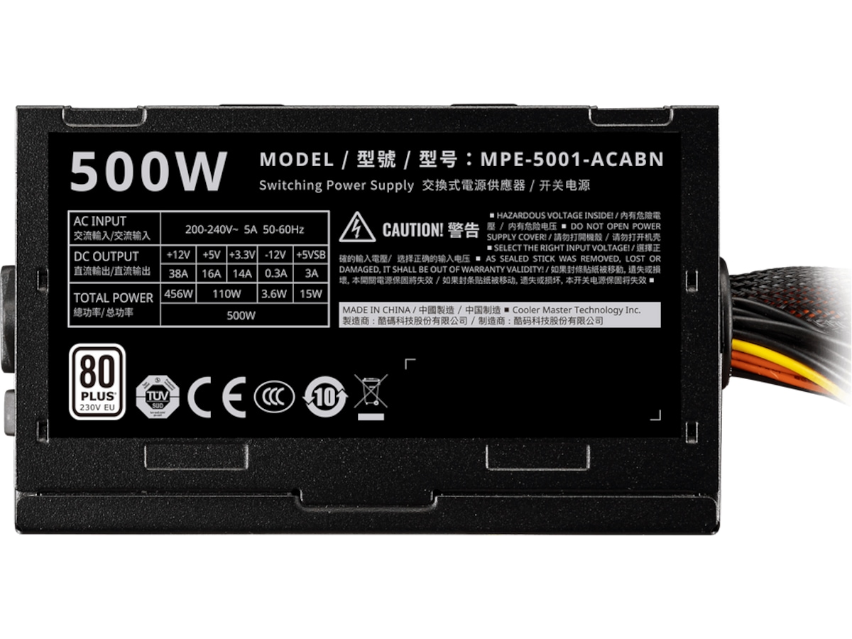 +12V - 38 A, +5VSB - 3 A, -12V - 0.3 A, +5V - 16 A, +3.3V - 14 A