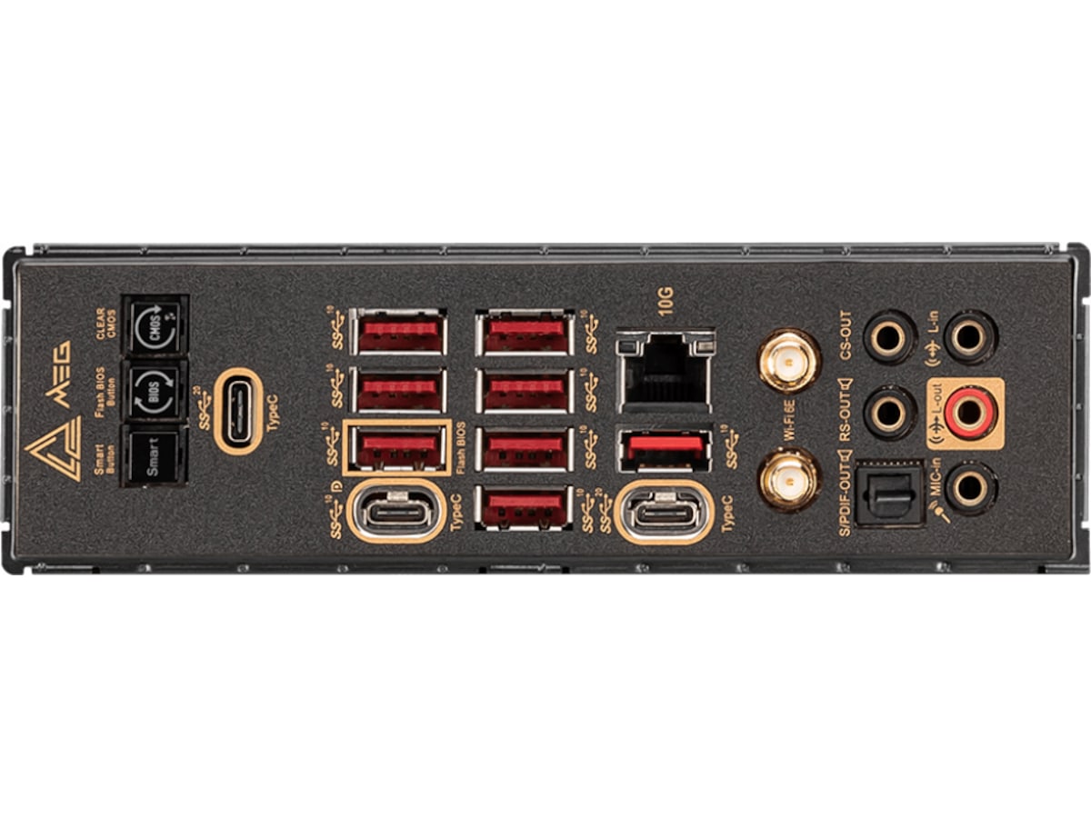 Grensesnitt 1 x lydutlinje - minijakk, 2 x antenne, 1 x LAN (10Gigabit Ethernet), 1 x lydutlinje (senter/subbasshøyttaler) - minijakk, 1 x SPDIF-utgang, 1 x lydinnlinje - minijakk, 1 x HDMI, 2 x USB-C 3.2 Gen2x2, 8 x USB 3.2 Gen 2, 1 x USB 3.2 Gen 1, 1 x DisplayPort, 1 x mikrofon - minijakk