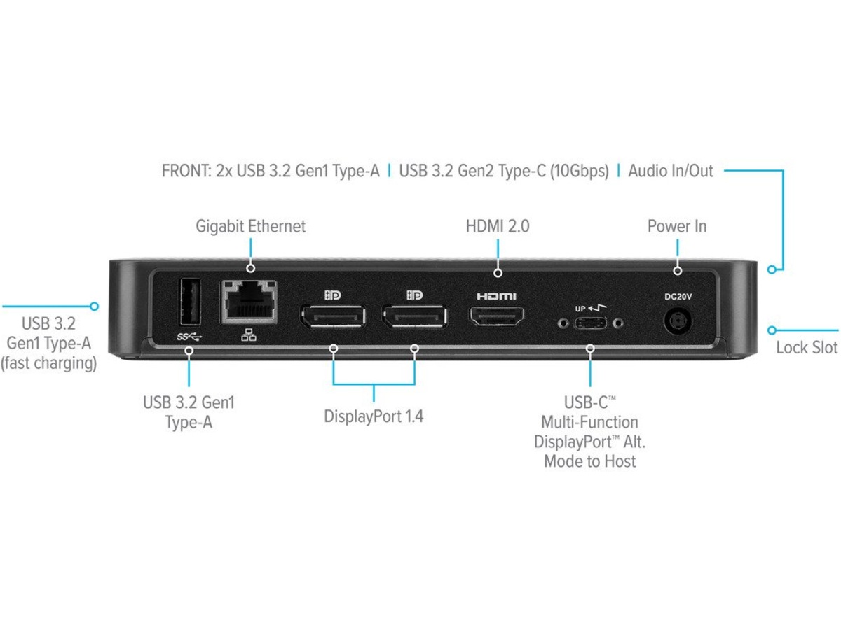 2 x skjerm/video - DisplayPort - 20-pins DisplayPort, 3 x USB 3.2 Gen 1 - 9-pins USB-type A, 1 x skjerm/video - HDMI - 19 pin HDMI Type A, 1 x USB 3.2 Gen 1 med Fast Charging - 9-pins USB-type A, 1 x lyd - hodetelefoner/mikrofon - 3,5 mm-minijakk, 1 x USB-C 3.2 Gen 2 - 24 pin USB-C, 1 x USB-C med Power Delivery (85 W) - 24 pin USB-C, 1 x nettverk - 10Base-T/100Base-TX/1000Base-T - RJ-45