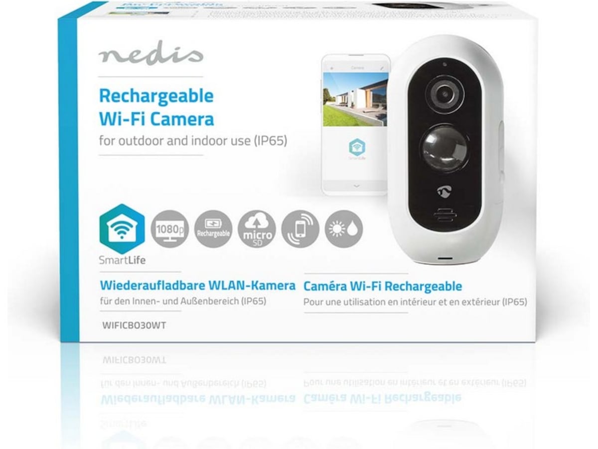 Dette brukervennlige Nedis® SmartLife oppladbare IP-kameraet til utendørs bruk er meget fleksibelt på grunn av det vanntette huset (IP65).
