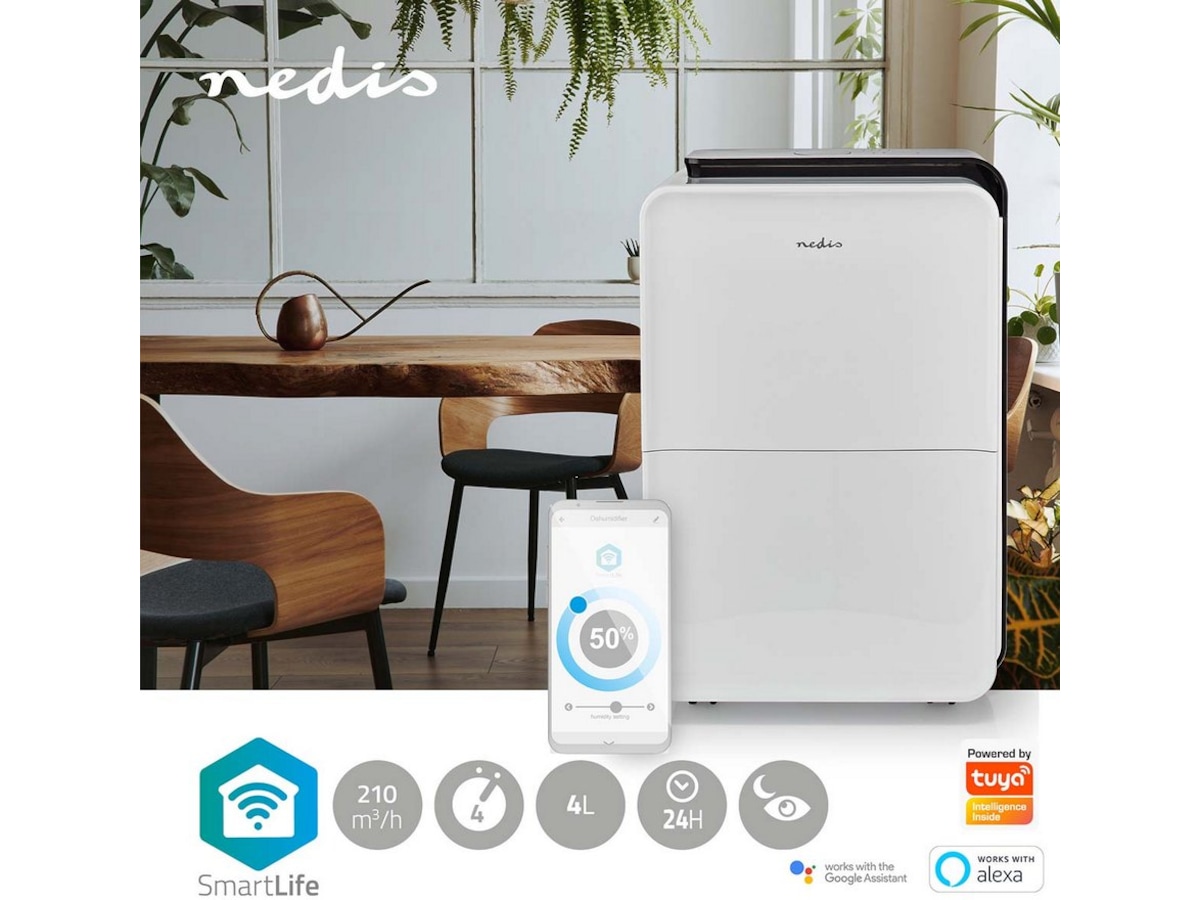 Du bare kobler den til hjemmenettverket og styrer den via Nedis® SmartLife-appen (iOS og Android) eller knappene på selve avfukteren. Den støtter også talestyring ved hjelp av Alexa og Google Assistant.